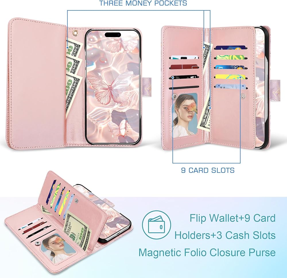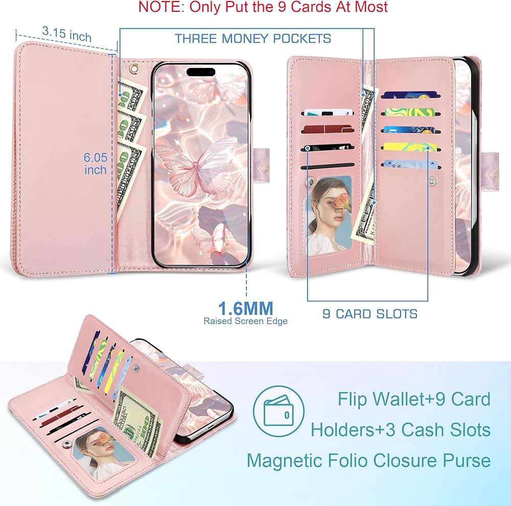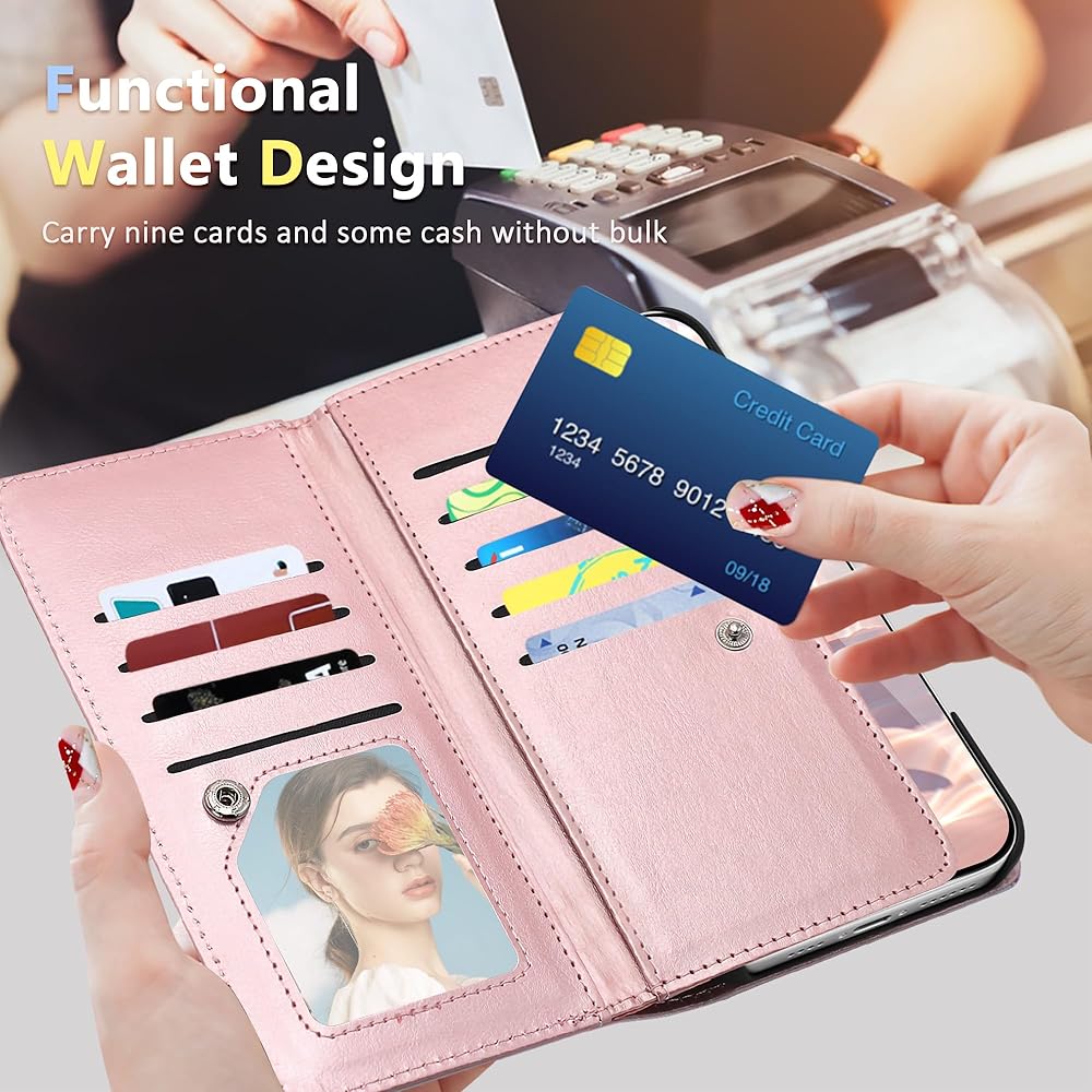 【9 Card Slots & Detachable Wrist Strap】 Inside features 9 card slots,one ID window and 3 bill compartments;Wrist strap is convenient to take your phone to anywhere