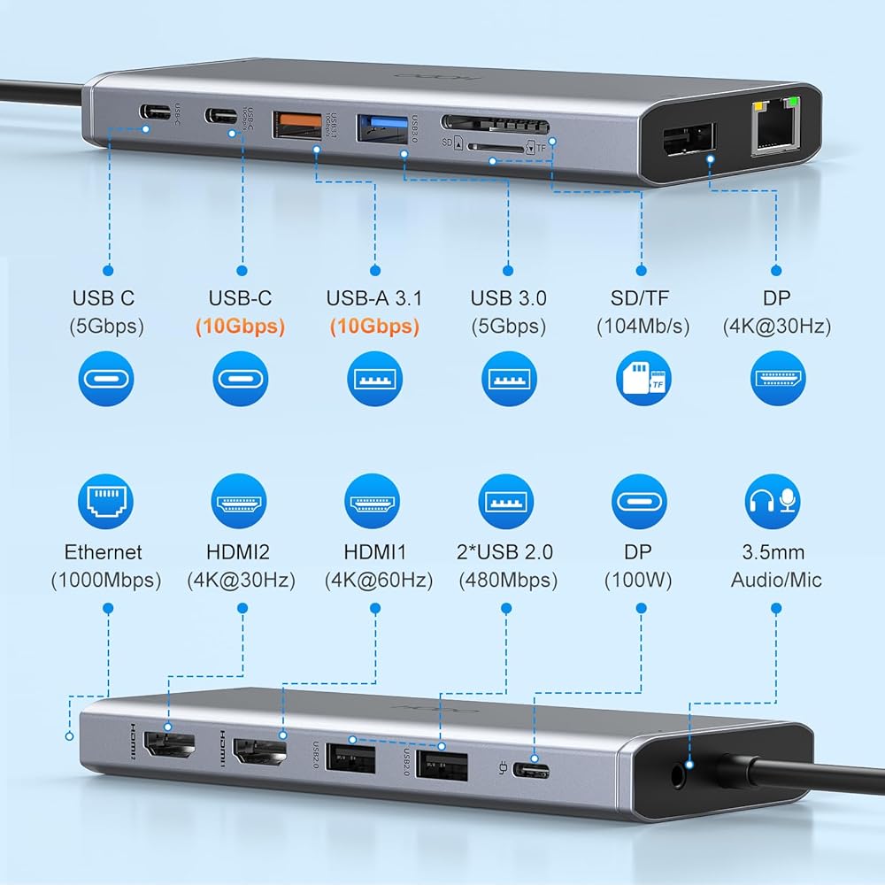 USB C Laptop Docking Station Dual Monitor HDMI for Dell/Lenovo/HP Laptop 14 in 1 USB C Hub Multiport Adapter Dongle Dock USB C to 2 HDMI 4K+DisplayPort+Ethernet+4USB+2USB C+100W PD Charger+SD/TF+Audio