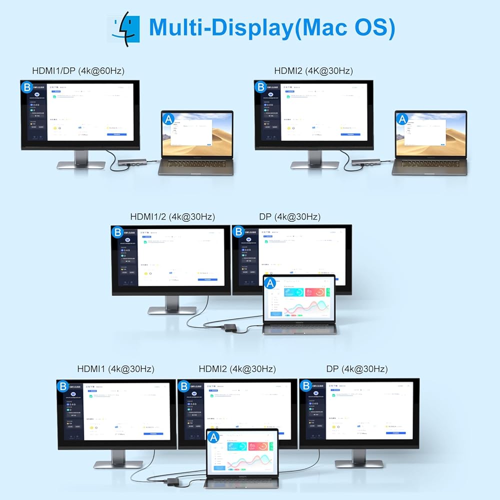 Dual and Triple 4K Display Multiple Adapter: This docking station dual monitor can easily achieve dual monitors,triple displays and quad monitors for Windows laptop.While single use HDMI/DP1/2resolution up to 【4K@60Hz, single use VGA resolution up to 1080@60Hz. When using DP1/2+HDMI, dual monitors will be 4K@60Hz and 4K@30Hz(DP1.4); When using HDMI+DP1+DP2, triple monitors will be 2*4K@60Hz+2K@60Hz (DP1.4); Display output will be 1080P when quadruple displays and multiple monitors with VGA