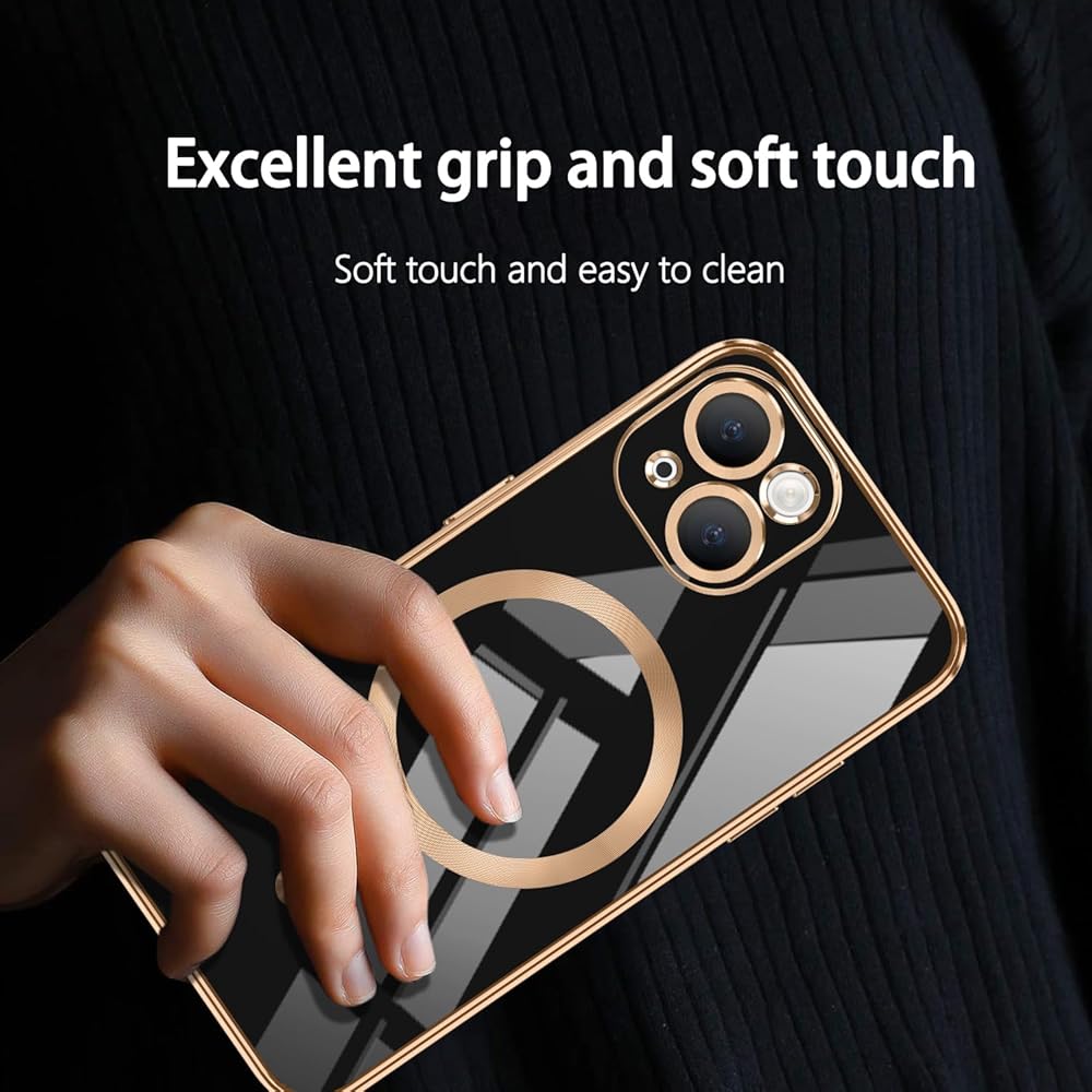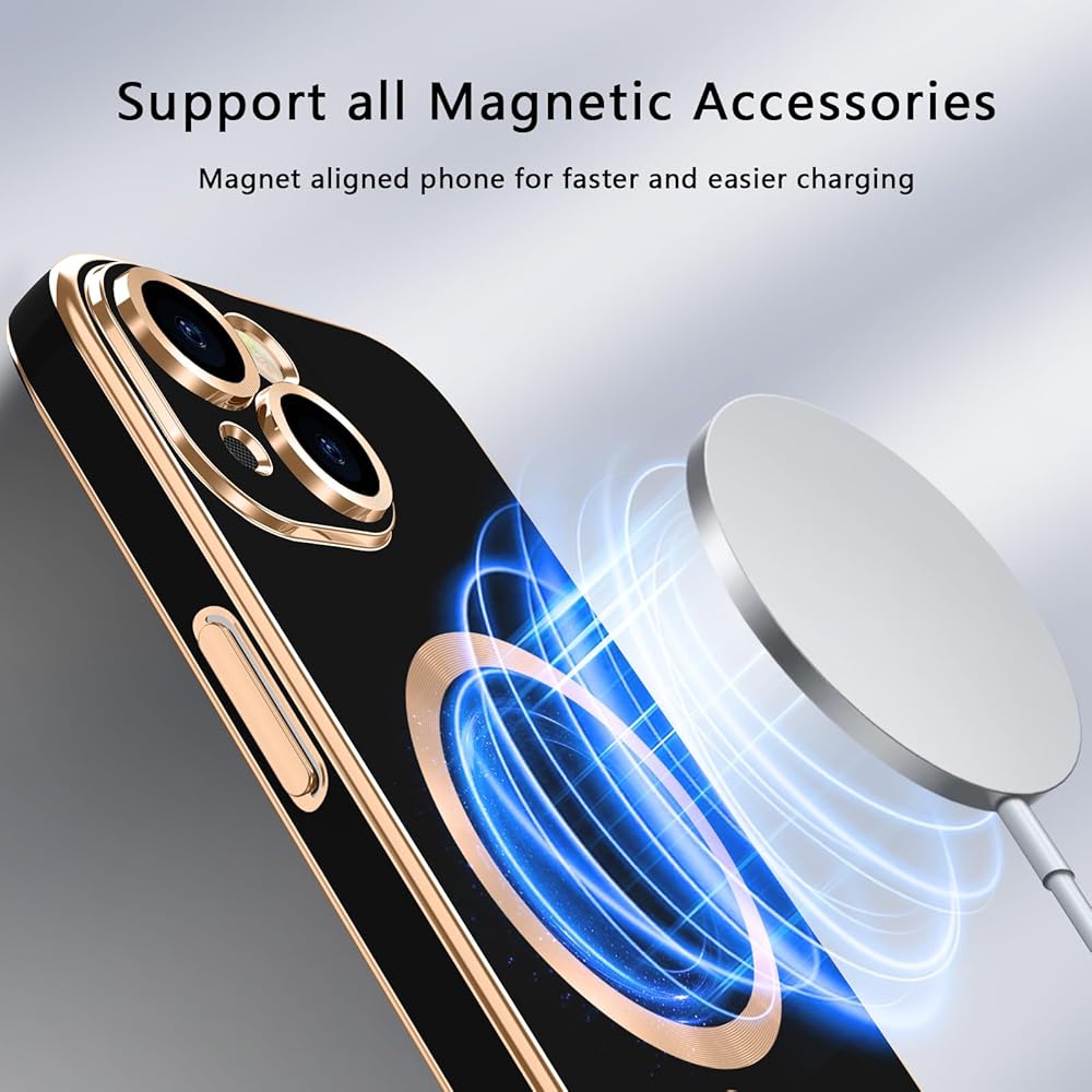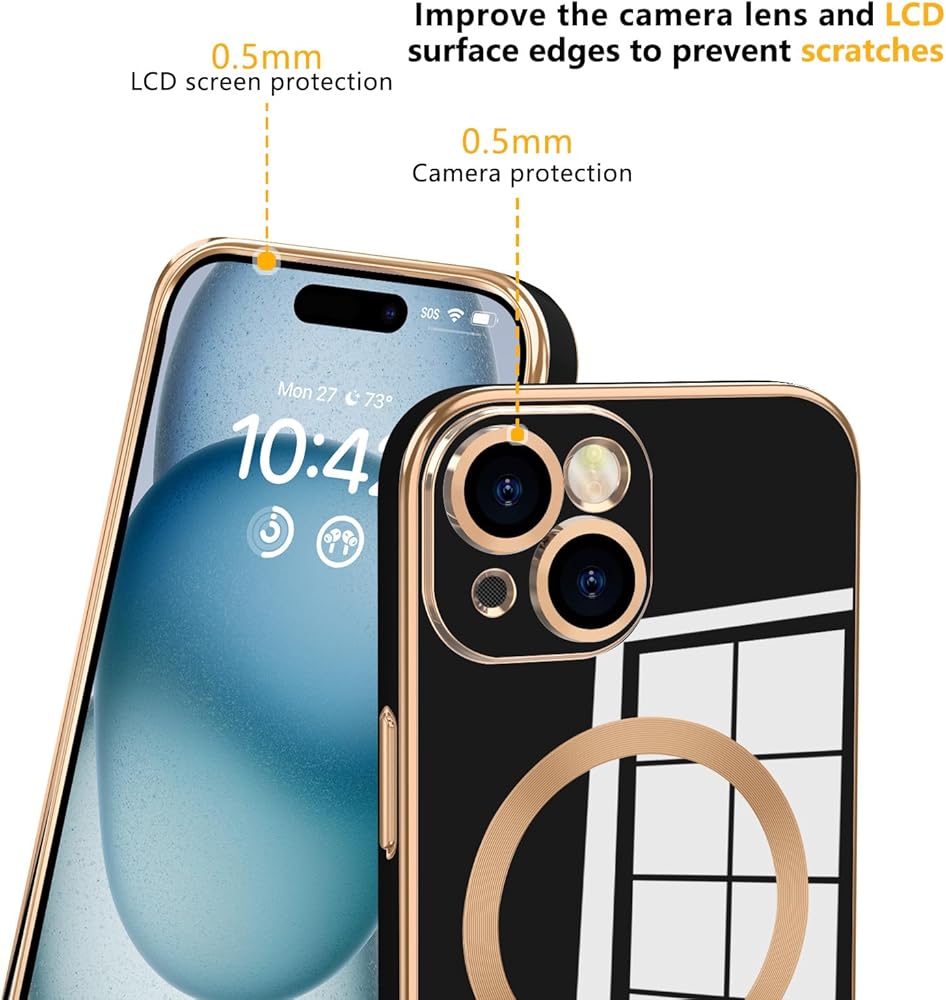 [Compatible Models] This phone case is only compatible with iPhone 15, please confirm the model when purchasing.[Magnetic Adsorption] Perfectly arranged magnets make wireless charging faster and easier than before. And the built-in magnetic ring can strengthen the magnetic connection, compatible with most the magnetic accessories, such as wireless chargers, magnetic car mounts, magnetic wallets, etc., the super strong magnetism provides excellent stability, don't worry about shaking and shaking.[Luxurious and Exquisite Electroplating Process] Premium soft thermoplastic polyurethane(TPU). This phone cover has plating technology on the edge of the frame, camera lens edge and buttons. The electroplated lines, shining in the light or sunlight, all in all makes your phone look unique and noble. Sleek and lightweight, adds reasonable protection without being too bulky and clunky.[Upgraded Screen Protection] Raised lips offer extra protection to screen and camera. A durable and reliable anti-scratch surface will help prevent scratches to the screen during daily-wear-and-tear, minor or accidental drops, and even tight pockets, keep the screen free from scuffs and scratches.[Slim Fit & Comfortable Grip] Soft and sensitive buttons with good response, are easy to press. Perfect match and fit for device that also retains easy access to all functionalities, including all buttons, camera, headphone jack, speakers, microphone and charging port.