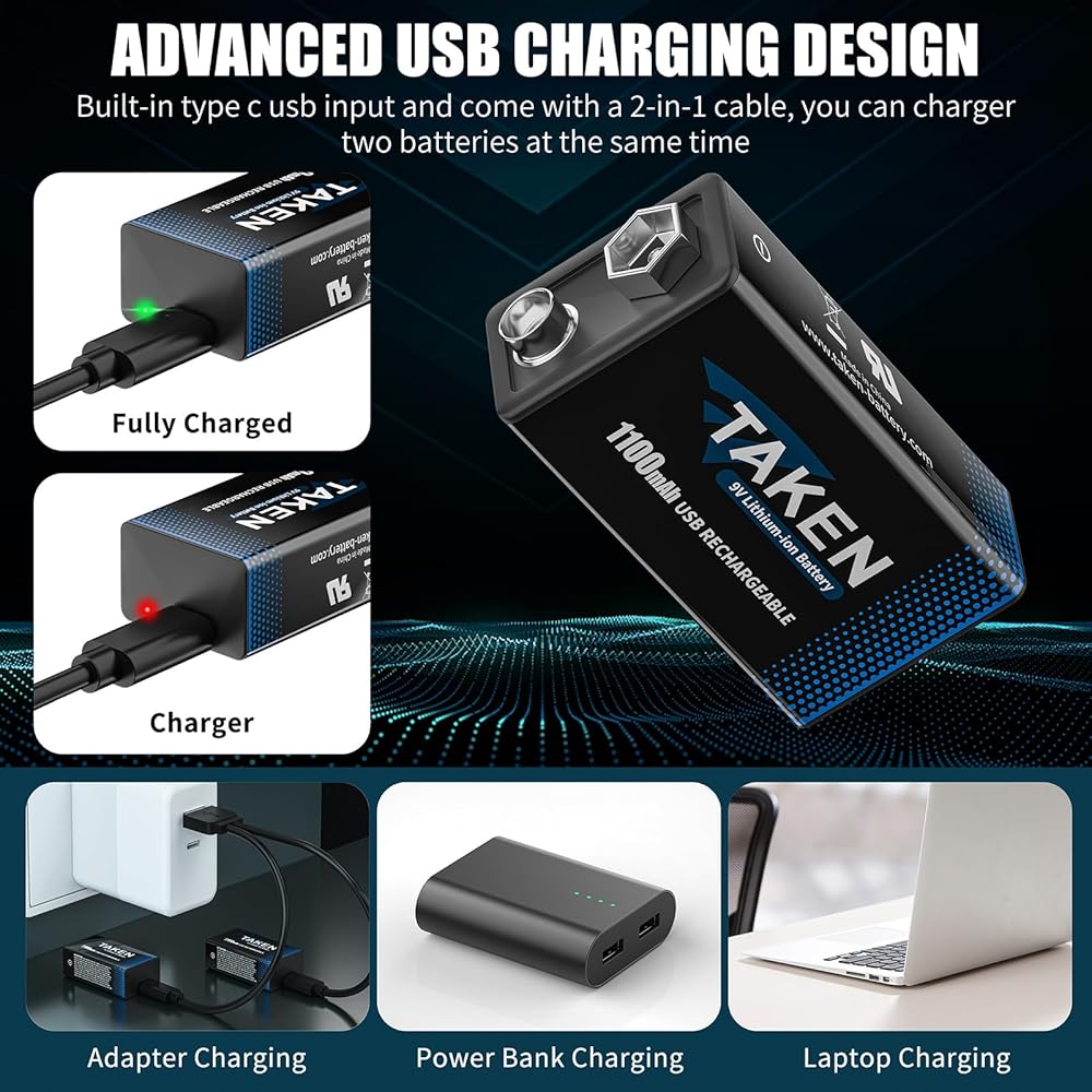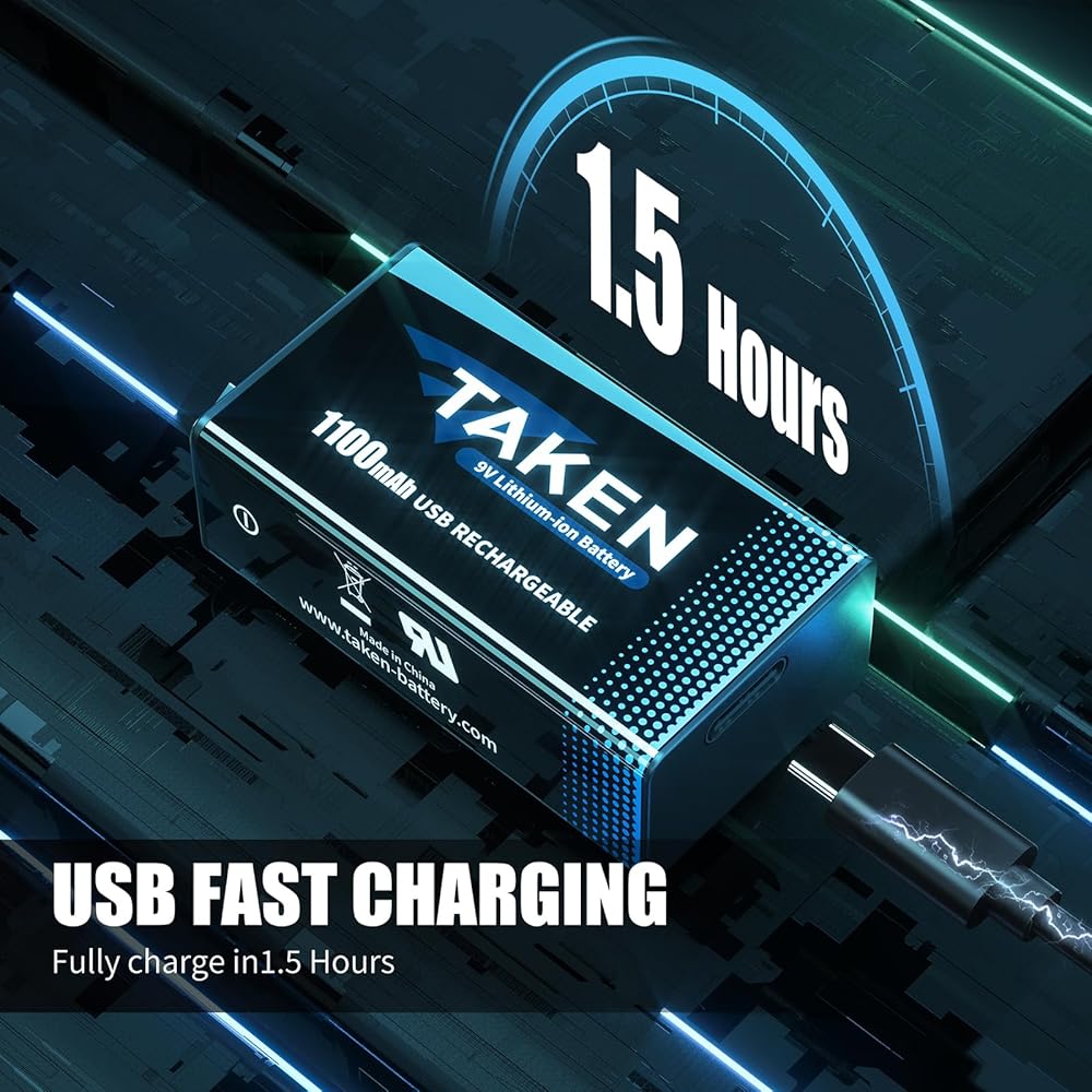 قم بتوصيل USB بمنفذ شحن من النوع C على بطارية 9 فولت نفسها. مؤشر LED يوضح حالة الشحن، أحمر للشحن وأخضر للشحن الكامل.