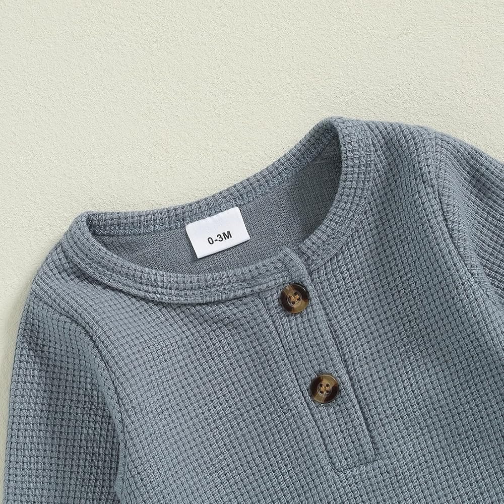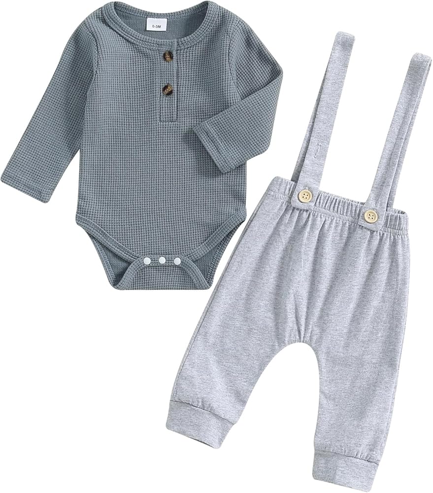 Design: Infant boys romper with button-up at the collar, solid color long sleeve top, comes with suspender pants with button trim. Make your baby comfortably and look fashionable.