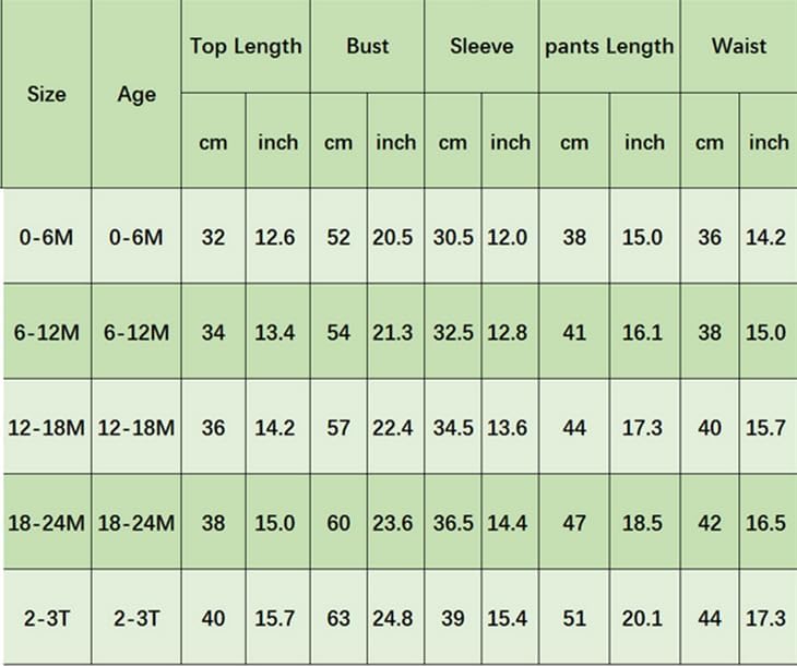 6-9M Tops Length: 13.39 Bust: 22.05 Pants Length: 16.54 Waist: 14.96 Advised Age: 6-9 Months