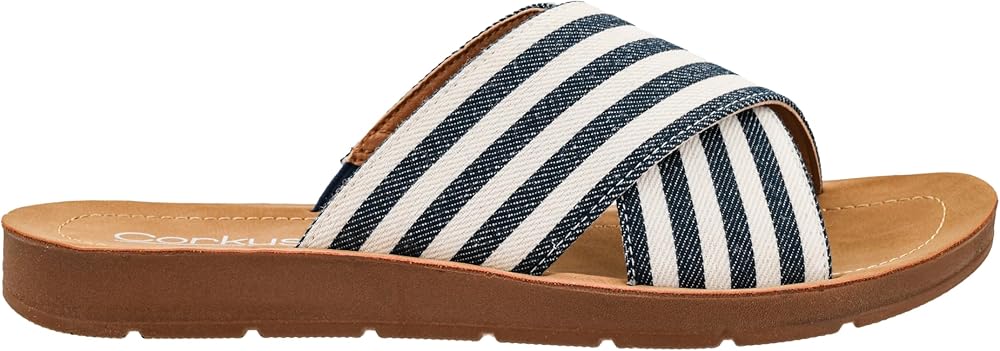Experience the ultimate blend of comfort and chic style with Corkys Footwear Women's Dig It Woven Strap Slip On Sandals. These sandals feature an elegant, minimalist design, perfect for a variety of occasions. The sandal showcases a sleek, woven strap upper, arranged in a crisscross fashion that elegantly frames and secures the foot. This strap design not only provides a secure fit but also adds a tactile, stylish texture that catches the eye. The footbed is noticeably cushioned, promising comfort with every step, and is contoured to support the natural shape of the foot. The overall look is completed with a subtle, flat sole that ensures stability while maintaining a slim profile, making these sandals both practical for everyday wear and stylish enough for more dressed-up events.
