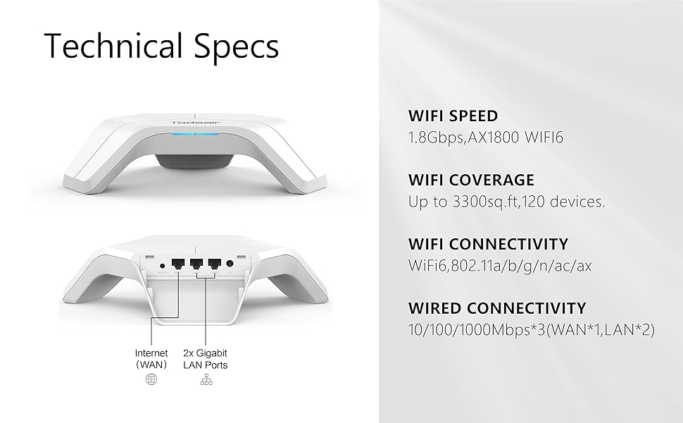 【Extensive Coverage】:It is equipped with 4DBi and 5DBi antennas with high-performance signal enhancement modules and has coverage up to 3,300 sq.ft. It can be used by 120 devices, eliminating WiFi blind spots and providing full WiFi6 coverage for medium and large families.