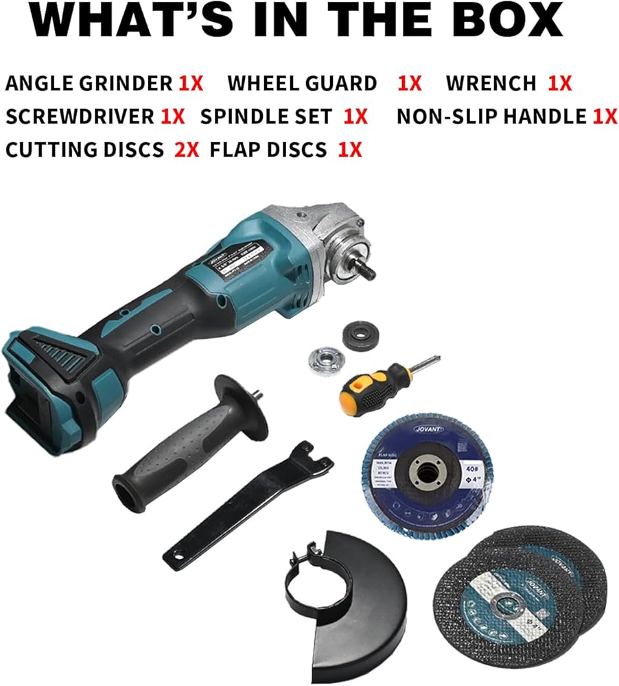 【Complete Package】In addition to the cordless angle grinder itself, this package includes a variety of accessories to meet your needs. It comes with 1* wheel guard, 1* wrench, 1* screwdriver, 1* spindle set, 1* non-slip handle, 5* cutting disc, 5* flap disc(40/60/80/120/240 grit) ,1* tool bag, 1* manual .