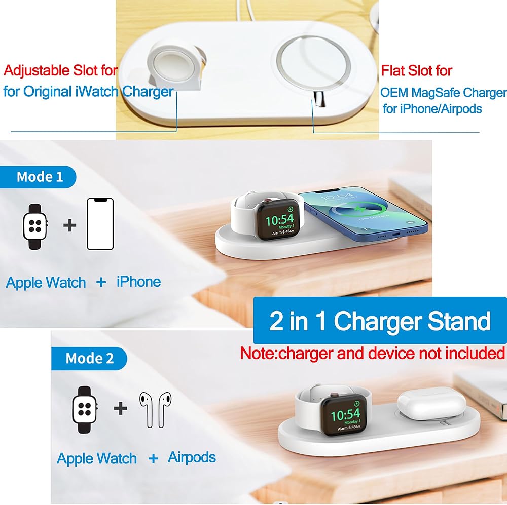 【𝐖𝐢𝐝𝐞 𝐂𝐨𝐦𝐩𝐚𝐭𝐢𝐛𝐢𝐥𝐢𝐭𝐲】: The 2 in 1 wireless charger holder with two charger slots is designed specifically for Original Apple Charger, Only supports 56 mm iPhone Mag Safe charger and 27.5 mm Apple watch magnetic charger or same size as it. Compatible with Apple iPhone 15/ 15 Plus /15 Pro/ 15 Pro Max iPhone 14/ 14 Plus /14 Pro/14 Pro Max/ 13/ 13 Pro/ 13 Pro Max/ 13 Mini/ 12/ 12 Pro/ 12 Pro Max/ 12 Mini and Apple Watch Series 9/8/Ultra 2/Ultra/SE2/7/6/SE/5/4/3/2/1. When not charge iphone, can use to charge Airpods 3/ AirPods Pro 2/ Airpods pro/ Airpods 2 with wireless charging box