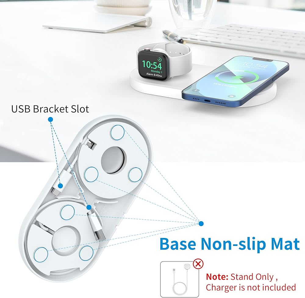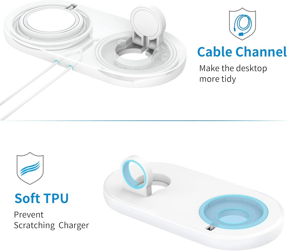 【𝐎𝐧𝐥𝐲 𝐀 𝐒𝐭𝐚𝐧𝐝】: This iPhone and Apple Watch charger stand with two slots for iPhone Mag Safe charger & iwatch magnetic charger,can perfectly hold your Mag-Safe charger and Apple Watch charger. (𝐏𝐥𝐞𝐚𝐬𝐞 𝐍𝐨𝐭𝐞:𝐌𝐚𝐠-𝐒𝐚𝐟𝐞 𝐂𝐡𝐚𝐫𝐠𝐞𝐫 𝐚𝐧𝐝 𝐂𝐚𝐛𝐥𝐞 𝐍𝐎𝐓 𝐢𝐧𝐝𝐜𝐥𝐮𝐝𝐞𝐝), a holder designed for these friends who own original Mag Safe charger and Apple watch charger and want a space saver to organize apple wireless accessories together. It is convenient for you use the OEM iPhone and Apple Watch charging station to get the fastest charging and you can easily charge your everyday apple devices in one spot. Great mag safe accessory for You