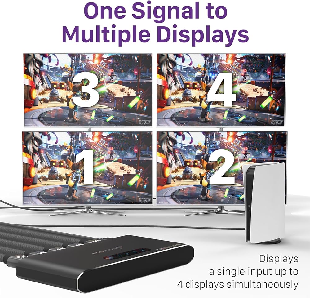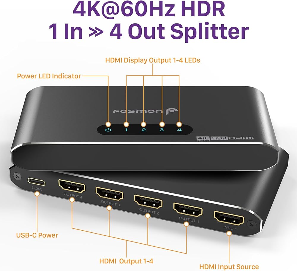 Fosmon HDMI Splitter 1 in 4 Out (4K@60Hz) 4 Port HDMI Splitter with EDID Down-Scaler for Dual Identical Display Support Compatible with PS5/4/3, Xbox, Nintendo, Switch, Roku TV, Fire Stick