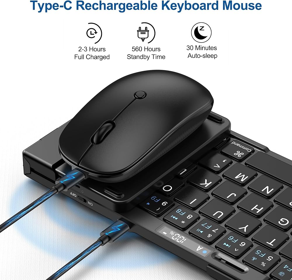 【Electronic Display and USB-C Charging】The portable foldable keyboard is equipped with a smart electronic screen that displays battery levels in real time and alerts you when the battery is low. It also shows the status of the numeric keypad and Caps Lock functions, keeping you in control at all times. The foldable keyboard and mouse combo can be easily charged via the included USB-C cable, offering up to 90-120 days of standby time after a 2-3 hour charge, meeting your needs for short business trips or vacations.