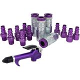 Introducing our comprehensive Starter Kit for pneumatic applications, combining essential air couplers, plugs, and a high-quality blow gun. Engineered for durability, the kit features a scratch-resistant steel design with an anodized coating, ensuring optimal wear resistance even in demanding environments. With compatibility across ColorFit by Milton M-Style, and red competitor couplers/plugs, this kit offers seamless connections without compatibility issues. The color-coded design allows for easy matching between air lines, enhancing safety and efficiency in your workspace. The kit includes 6 male plugs, 4 female plugs, 2 male couplers, and 2 female couplers, all equipped with 1/4" NPT fittings, providing a complete solution for various pneumatic tasks. Our lever thumb-trigger style blow gun boasts a rubber tip nozzle, offering a tight and leak-proof fit that prevents air leaks and protects delicate surfaces from knicks and scratches. This feature makes it ideal for use in narrow spaces and ensures efficient operation across a range of applications. Whether you're removing debris, drying fluids, or undertaking project clean-up, our Starter Kit provides the tools you need for versatile pneumatic tasks. Experience reliability, convenience, and efficiency with our all-in-one solution for your pneumatic needs.