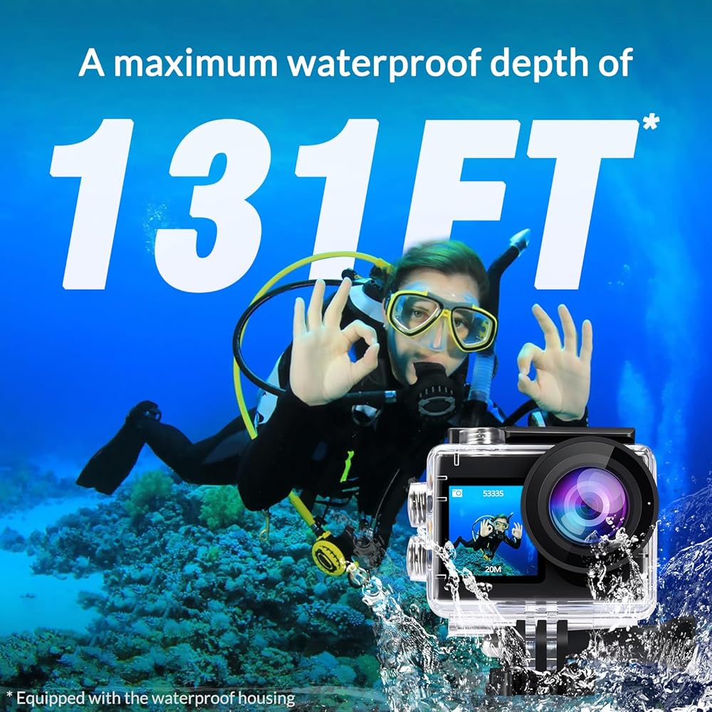 🏄🏻【𝟒𝟎𝐌 𝐖𝐚𝐭𝐞𝐫𝐩𝐫𝐨𝐨𝐟 𝐂𝐚𝐦𝐞𝐫𝐚】4K action cam with IP68 waterproof housing, durable waterproof up to 130 feet 40 m. Ideal for water sports such as swimming, driving, surfing etc. Comes with tons of free accessories, you can transform it to fit various indoor and outdoor extreme activities.