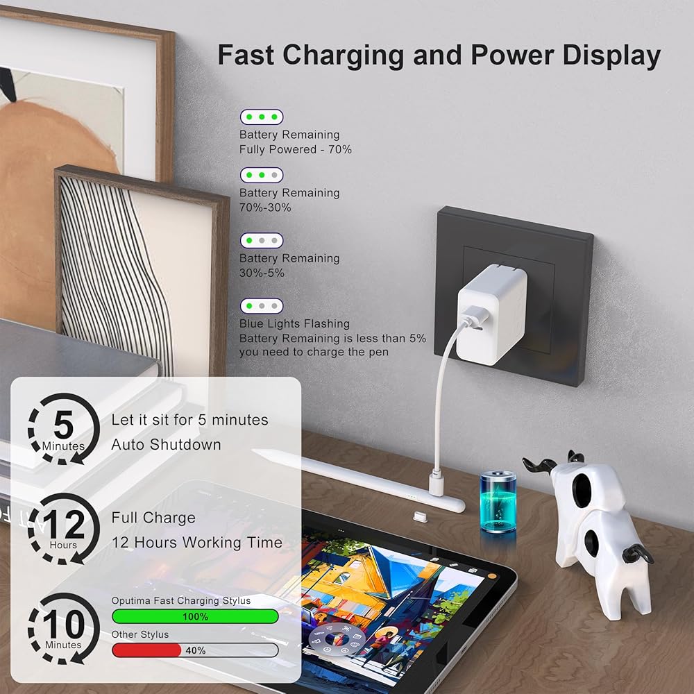 𝟏𝟎 𝐌𝐢𝐧 𝐅𝐚𝐬𝐭 𝐂𝐡𝐚𝐫𝐠𝐢𝐧𝐠 & 𝐋𝐨𝐧𝐠𝐞𝐫 𝐔𝐬𝐞 𝐓𝐢𝐦𝐞 - This apple pencil charge about 10 -13 minutes and allows 9 hours of continuous use (No fast charging adapter needed) . It auto shuts down after 5 minutes of inactivity to save power, just press the power switch when you use it again