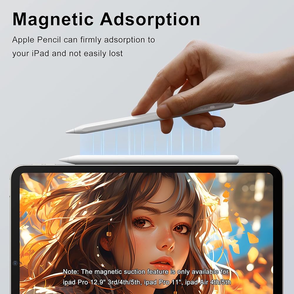 𝐒𝐮𝐩𝐩𝐨𝐫𝐭 𝐌𝐚𝐠𝐧𝐞𝐭𝐢𝐜 𝐀𝐝𝐬𝐨𝐫𝐩𝐭𝐢𝐨𝐧 - This 9th generation ipad pencil has magnetic adsorption function. Allow you ipad stylus pen adsorption to the side of your ipad so you can't lose it. 𝐍𝐨𝐭𝐞: Magnetic suction only works with 3rd, 4th and 5th generation ipad pro 12.9", 1st /2nd /3rd/ 4th generation ipad pro 11", 4th/5th Gen ipad Air. But it does not have magnetic wireless charging function