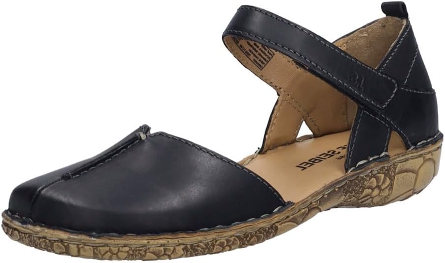 Welcome the warmer weather by wearing the Josef Seibel Rosalie 42 sandal. Mini wedge heel with floral imprint design throughout and closed toe. Strap with loop closure and leather upper. All leather upper and lining. Soft leather insole. Durable synthetic outsole.