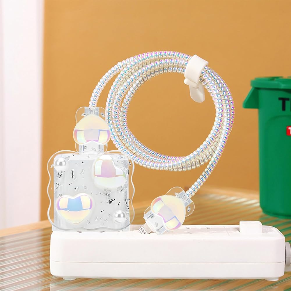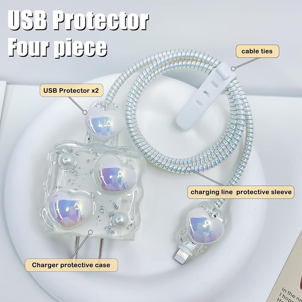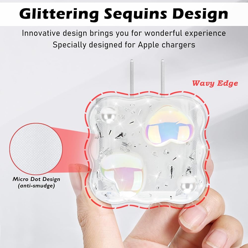 Cute Wave Cable Protector Compatible for iPhone Charger Adapter with Glitter Colorful Pearl Heart Design,Data Line USB Cover Wire Cord Saver Lightning Cable Case for iPhone Charger