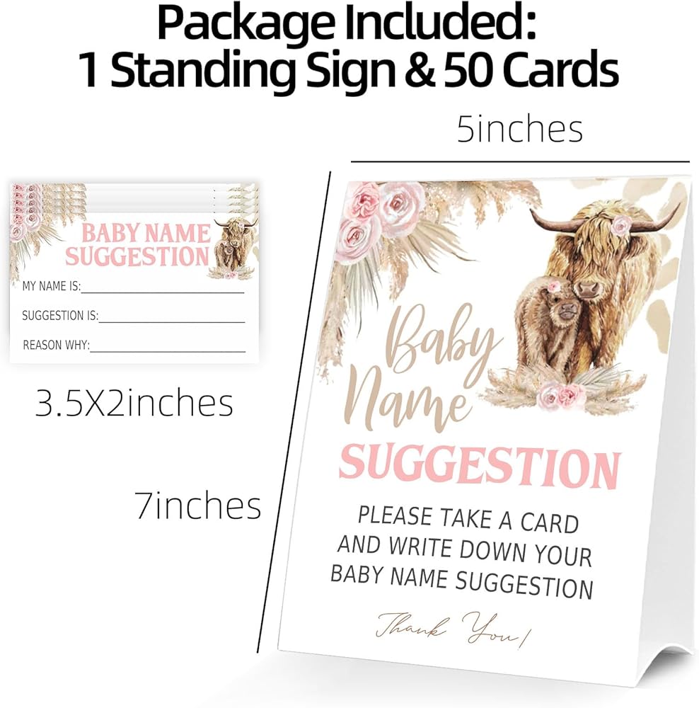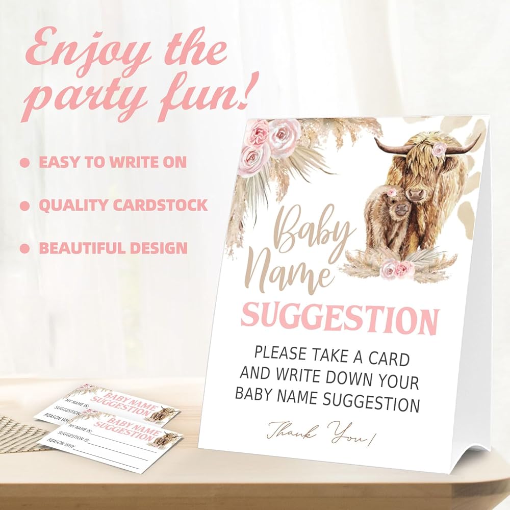 PRODUCT DESCRIPTION: Boho highland cow baby theme - These 1 Standing Sign & 50 name suggestion cards, allowing you to create a cohesive and enchanting party atmosphere.