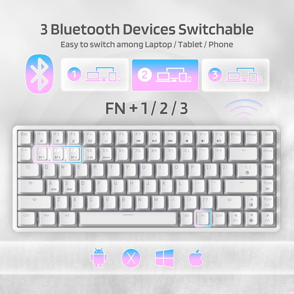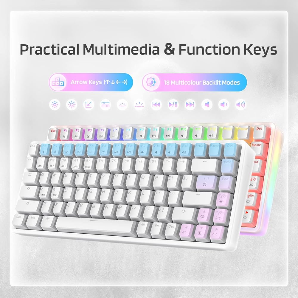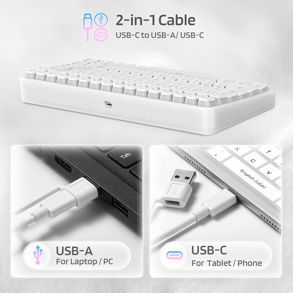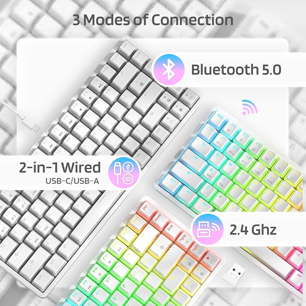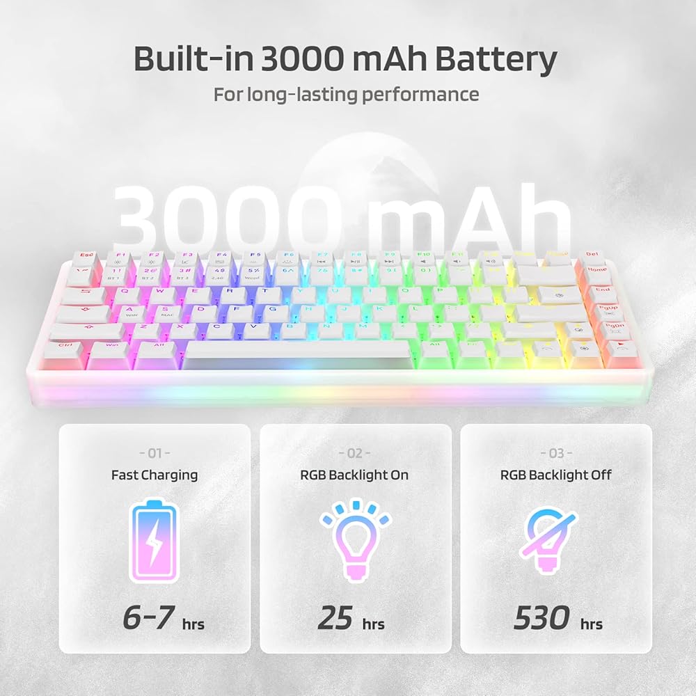 530-Hours Long-lasting Performance --- With a 3500mAh large-capacity battery, Neon75 75% mechanical keyboard allows you to use continuously for about 25 hours with RGB backlit on, and up to 530 hours with backlight off. Fully charged requires only 6-7 hours.