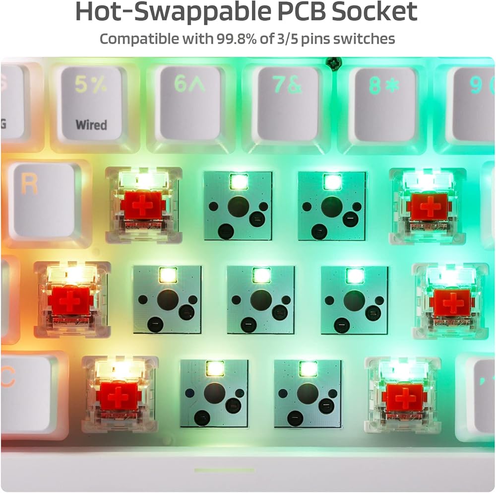 Dynamic RGB Backlight --- 18 preset backlight modes available on board. 5 brightness and flowing speed levels adjustable. PBT pudding keycaps also allow more light to shine through and enhance the RGB lighting effect.