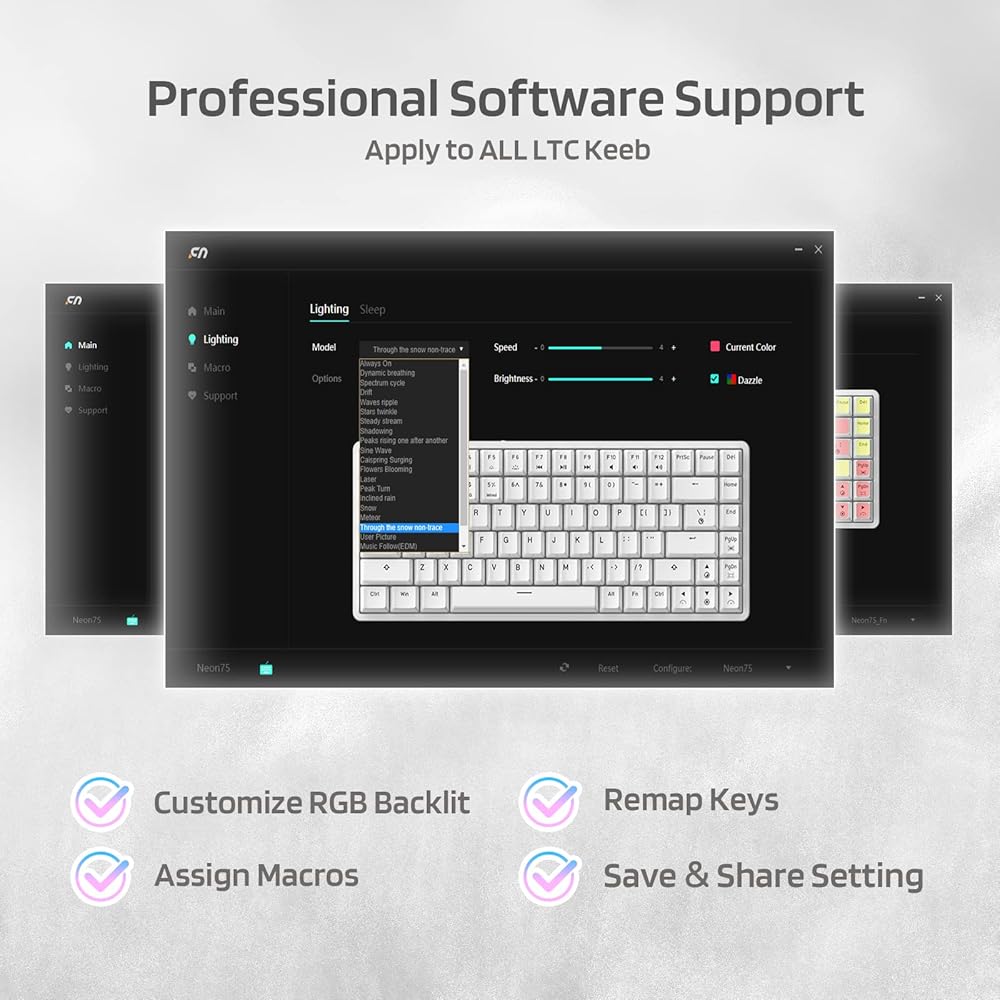 Professional Software Supports --- Remap keypress combinations, assign macros, and customize the RGB lighting effects with the powerful LTC drive. The keyboard is compatible with win7, win8, win10, win11, iOS, and MAC systems.