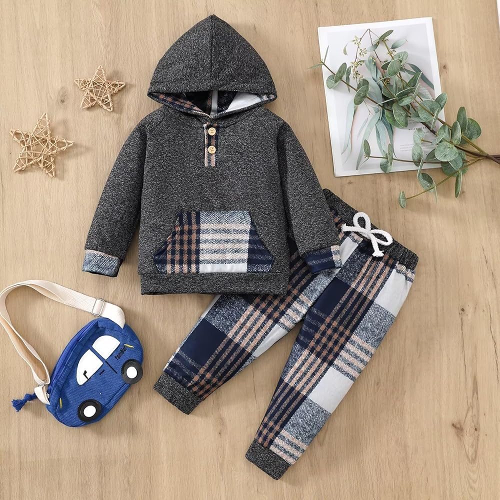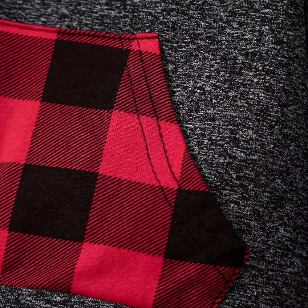 Heartwarming Design: Cute classic plaid hoodie sweatshirt with convenient buttons, easy to put on/take off, they also provide more room for your baby to grow. The large kangaroo pocket is stylish and practical, it can be stored some small items. Hooded design and windroof cuffs to keep your toddler boy warm in cold weather.