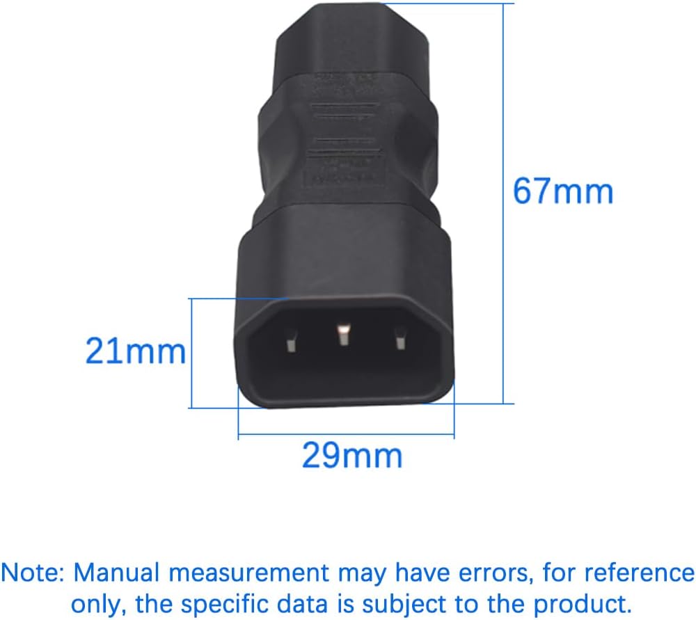 「Product application scope」Used to connect a device with a C14 plug, such as a computer, printer, or server, to a power cord or wall outlet with a C5 socket. By using C14 to C5 adapters, it is possible to achieve compatibility between different types of plugs and provide the required power connection to the device.Suitable for PDU cabinets and industrial engineering dedicated, or other peripherals, printers, rice cookers, electric cars, etc.