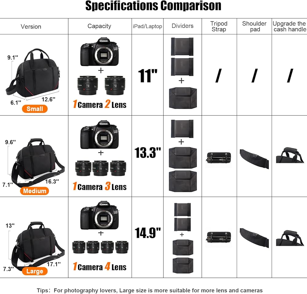 【Main Capacity】- Exterior Dimensions: 17.1 x 7.3 x 13 inches.This camera bags for photographers is fits for 1 DSLR camera/Micro-camera body+four lenses + 14.9 inch laptop + mobile phone + SD card. Case Only! (Device and accessories are not included). You can carry your favorite small tripodto the straps under the bag so you won't have to carry it separately.