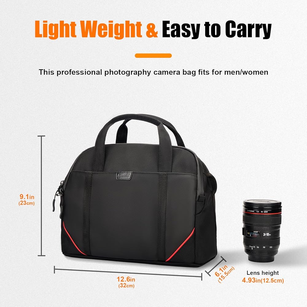 【Removable Dividers & Multiple pockets】- 3 removable dividers enable you to customize the main compartment to fit your gear. The camera shoulder bag is padded with soft foam around the bag to protect camera gear from bumps and shocks. 3 inner pocket and 1 front zipper pocket are both designed for you to access some frequent used items conveniently, such as your phone, tablet, wallet, sd cards, and other small items.