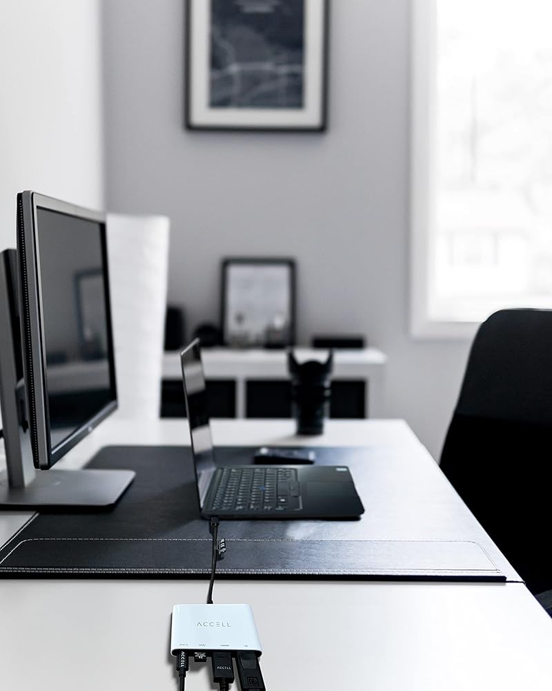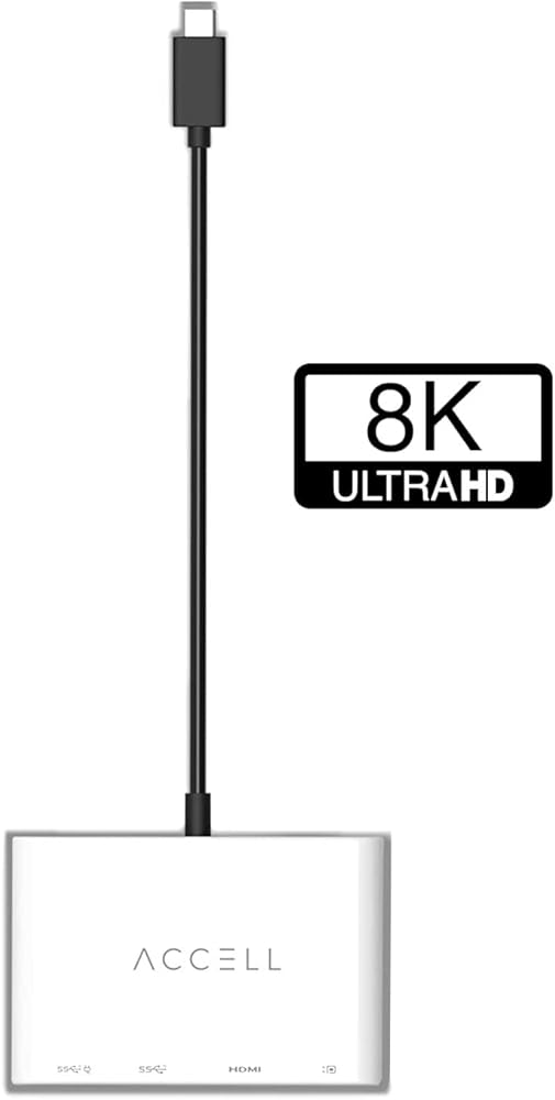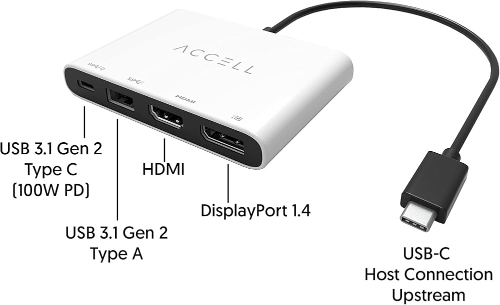The Accell USB-C Mobile Multiport Adapter is a compact USB hub that supports one 8K or two 4K displays through the equipped DisplayPort 1.4 and HDMI ports. It also provides USB 3.1 Gen 2 Type A and Type C ports for USB device connections and up to 10Gbps data transfer rate. The USB Type C port can alternatively support upstream Power Delivery and provide 90W of charging to the connected host when plugged in with a 100W power adapter.