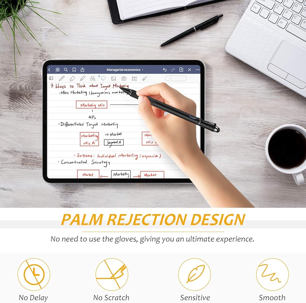 【Palm Rejection Design】Stylus pen with palm rejection technology provides a natural writing feeling and quick, effortless interaction with your screen, gives you more accuracy and control against the screen. We commend you to use this pen on the iPad with a glass screen protector.
