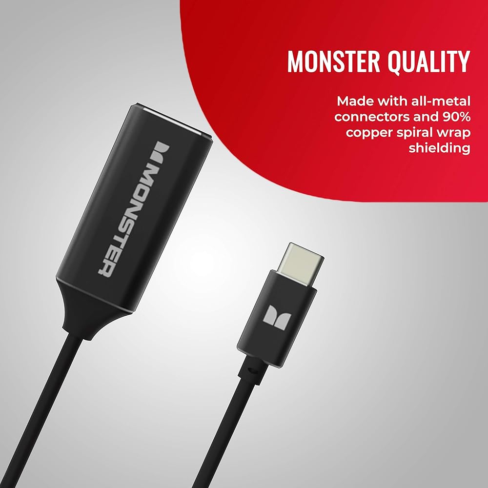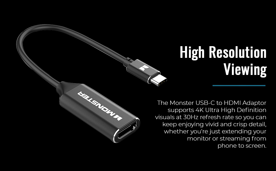 TOP NOTCH VISUAL SUPPORT: There's no need to worry about reduction in picture quality when you use the Monster USB Type-C to HDMI cable or adapter when you're streaming or editing files because it supports 4K Ultra High Definition resolutions at 30Hz refresh rate