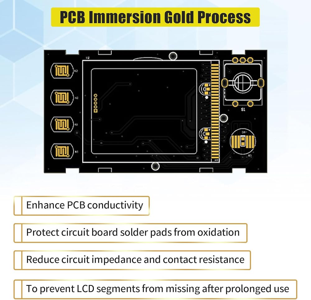 LCD display panel adopts gold-plating technology: to prevent segment deficiency after prolonged use of LCD, protecting circuit board solder joints from oxidation. Improve PCB conductivity, reduce line impedance and contact resistance.