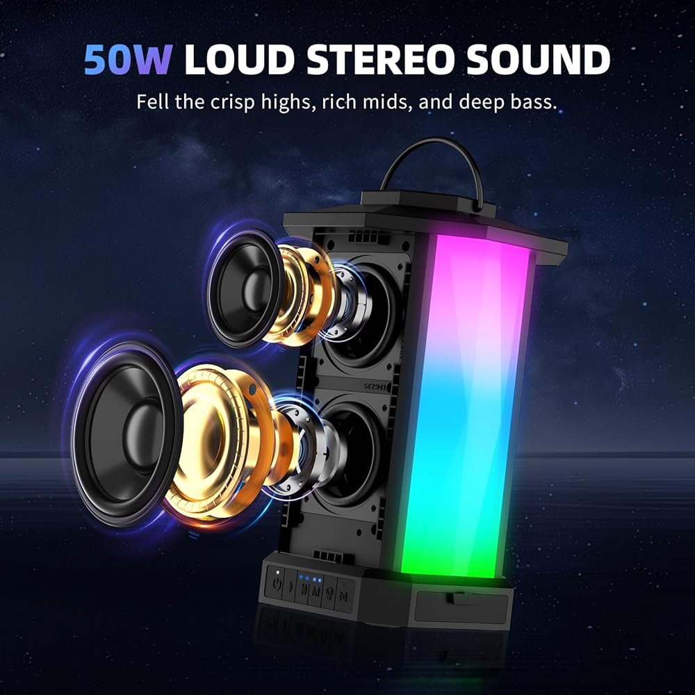 Ortizan Outdoor Speaker, Bluetooth Speaker with Lights, 50W Stereo Sound, IPX5 Waterproof, 24H Playtime, Sync up to 100 Wireless Speakers, Portable for Outdoors/Patio/Porch, Tech Gadgets, Gift for Men