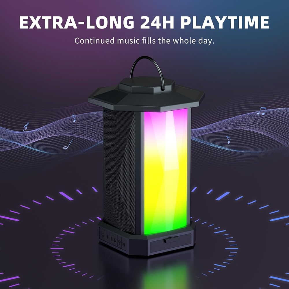IPX5 Waterproof and Durable: X12 speaker has IPX5 waterproof protection, which can easily prevent rain, dust, snow, and spills, making it ideal for outdoor use. The lampshade and speaker protection net is made of strong ABS material, and the diamond-cut surface can perfectly protect the LED lights and speakers from damage. So during family gatherings, you can safely use it as lighting and decoration for your garden, swimming pool, patio, porch, yard, wall, and table.