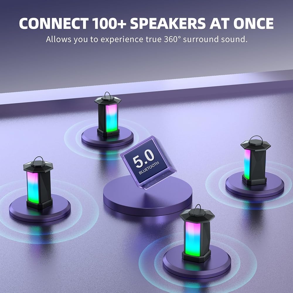 Crank up the Fun with Party Boost: With 4-unit Broadcast technology and advanced 5.8 GHz signal technology, outdoor Bluetooth speakers can realize up to 100 X12 zero-delay wireless connections at the same time, and through 360° surround sound music and multi-color lights Synchronized, bringing you a full range of sensory experience.