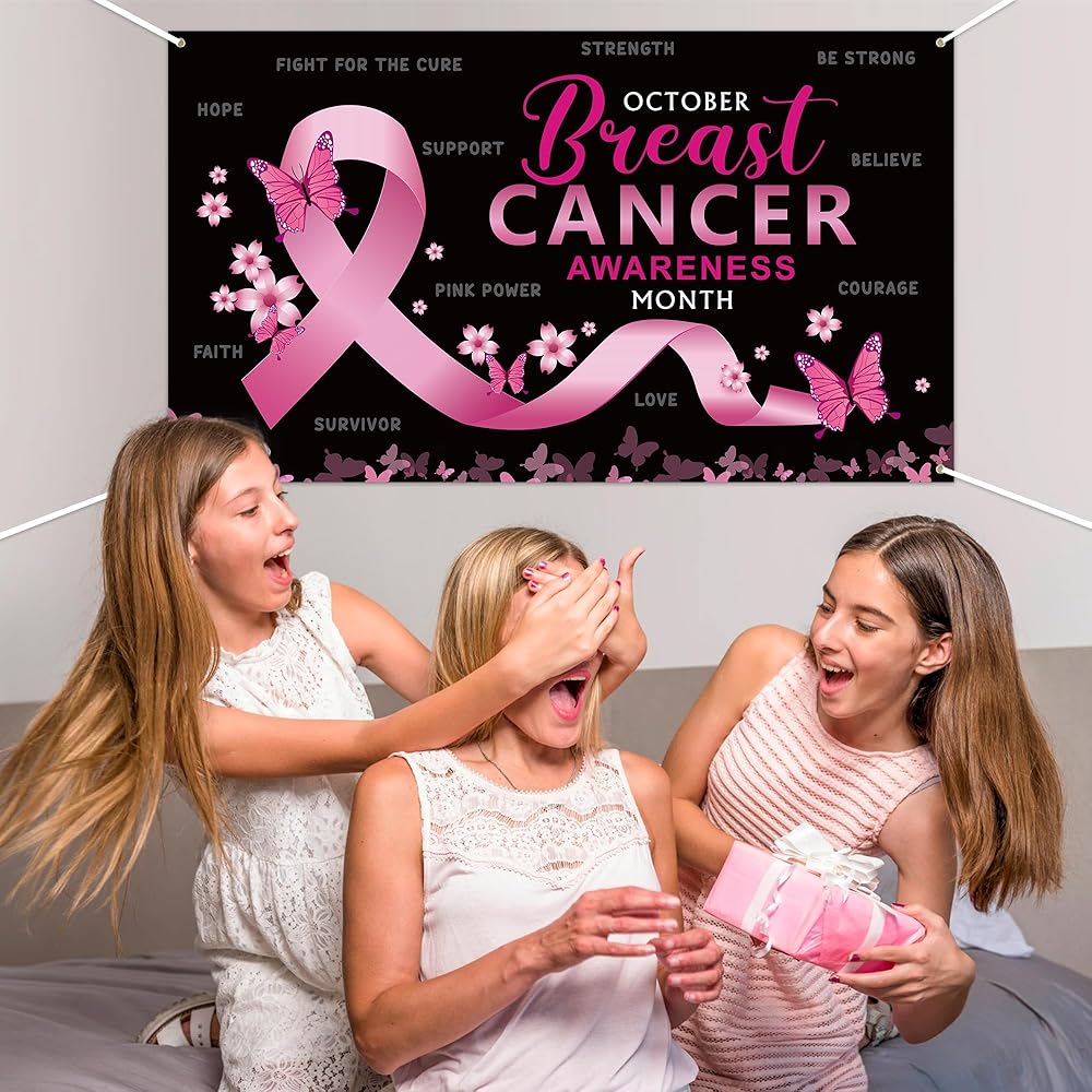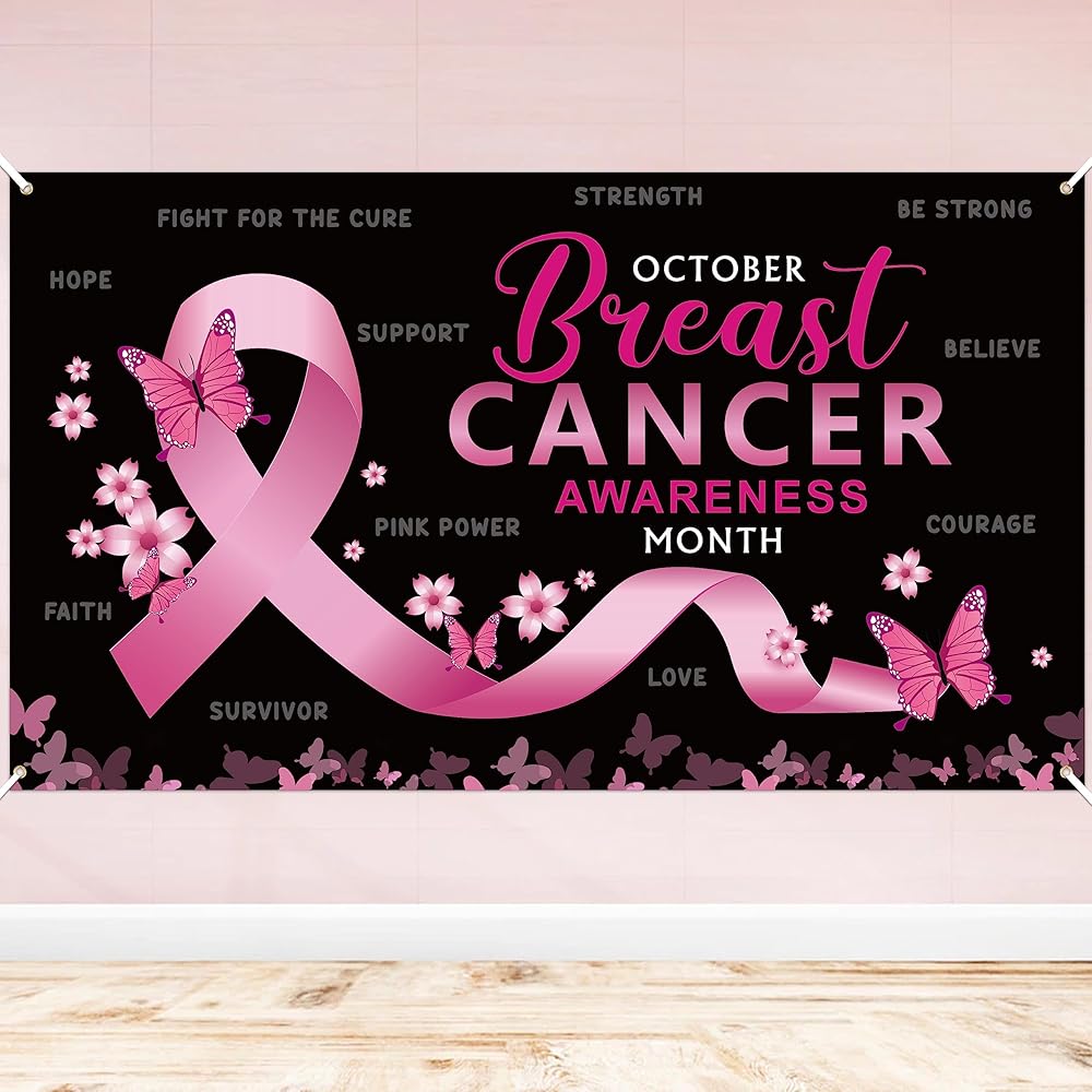 BREAST CANCER AWARENESS PARTY THEMED BANNERS:Breast Cancer Awareness party background banners that say "Breast Cancer Awareness Month" with patterns of Pink Ribbon, Flower, Butterfly and more, perfect to add a fun vibe to your Breast Cancer Awareness party and make you The party was even more impressive