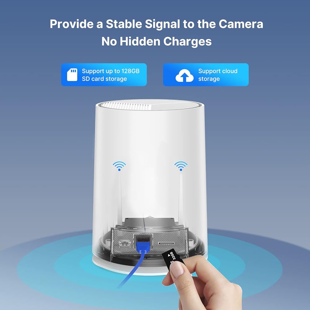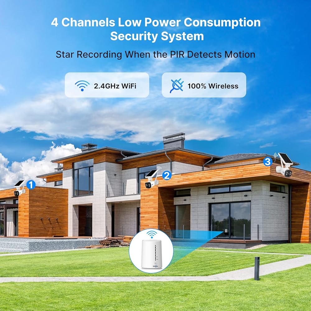 【Solar Panel Supply & 100% Wireless】This solar security camera rechargeable battery guarantees the wireless camera eternal power. No worry to take off the camera to charge. build in 5dbi antennae the camera has a stronger and more stable wireless connection. You can install the camera anywhere you want! (Note: The base station does not support connecting to the network through 2.4G WiFi, and can only connect to the router through a network cable.
