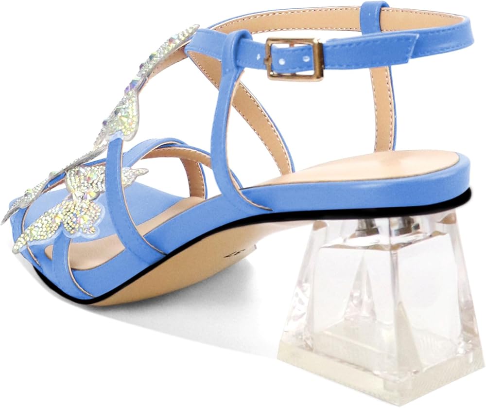 ★Joseywade Butterfly Heels For Women Crystal Rhinestone Butterflies Heels Clear Block low Heels Open Toe Heeled Sandals 2 Inch Ankle Strap Shoes