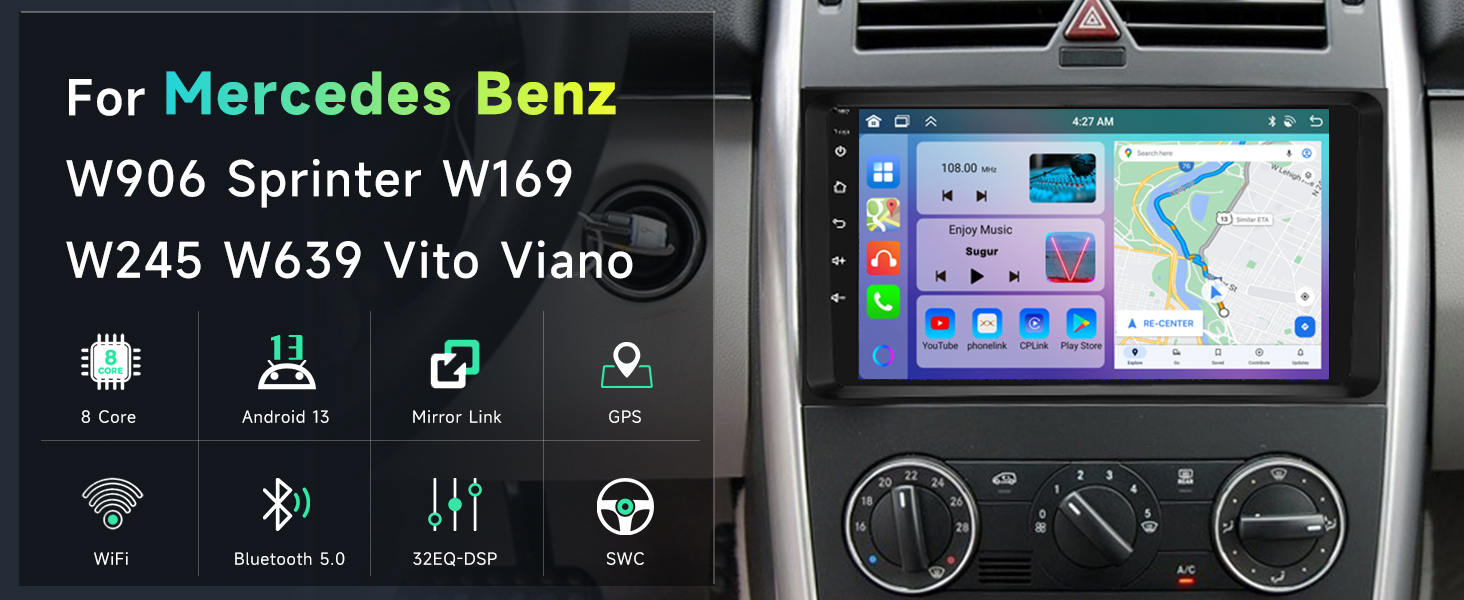 For Mercedes Benz Radio Upgrade: This car radio fits for Mercedes Benz W906 Sprinter W169 W245 W639 Vito Viano . No need to modify car power cables with the plug and play wiring harness