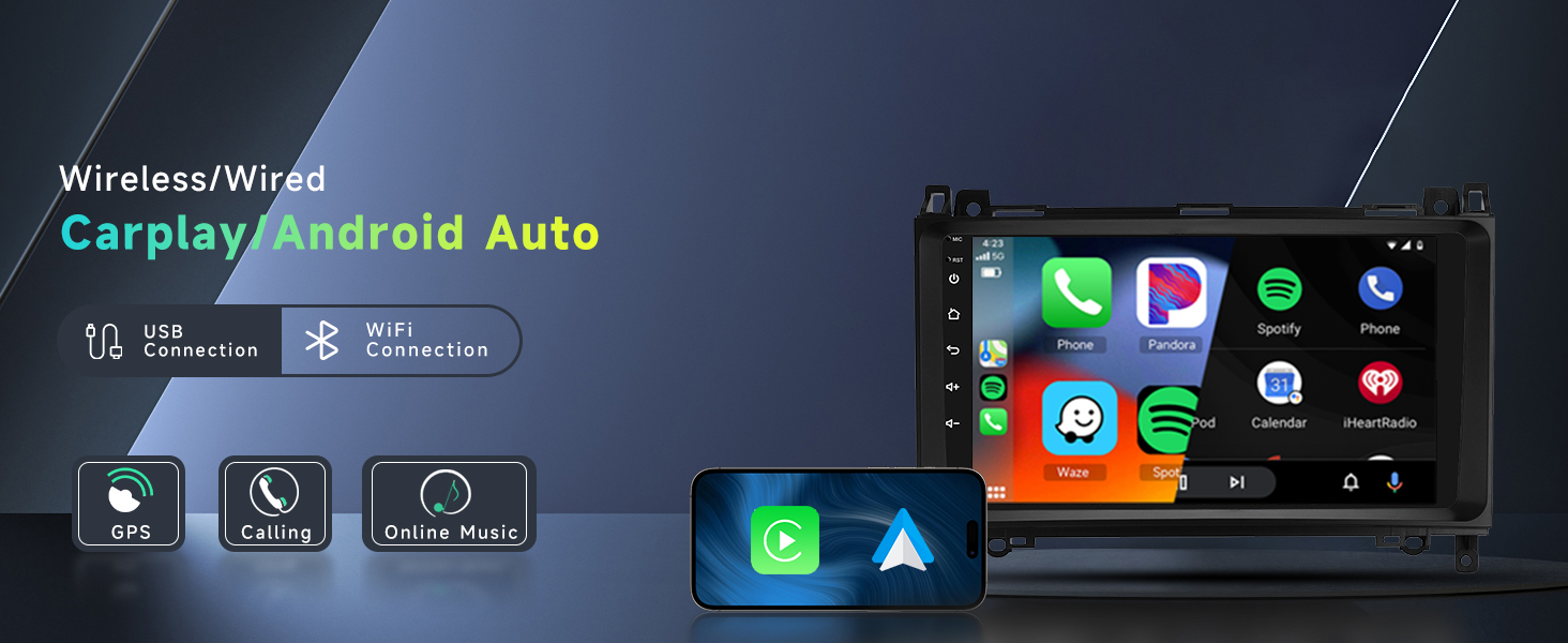 Carplay and Android Auto: This touch screen car stereo for Mercedes-Benz supports wireless and wired connections for CarPlay and Android Auto, providing instant access to calls, maps, music, and more. It also supports superior voice control through Siri