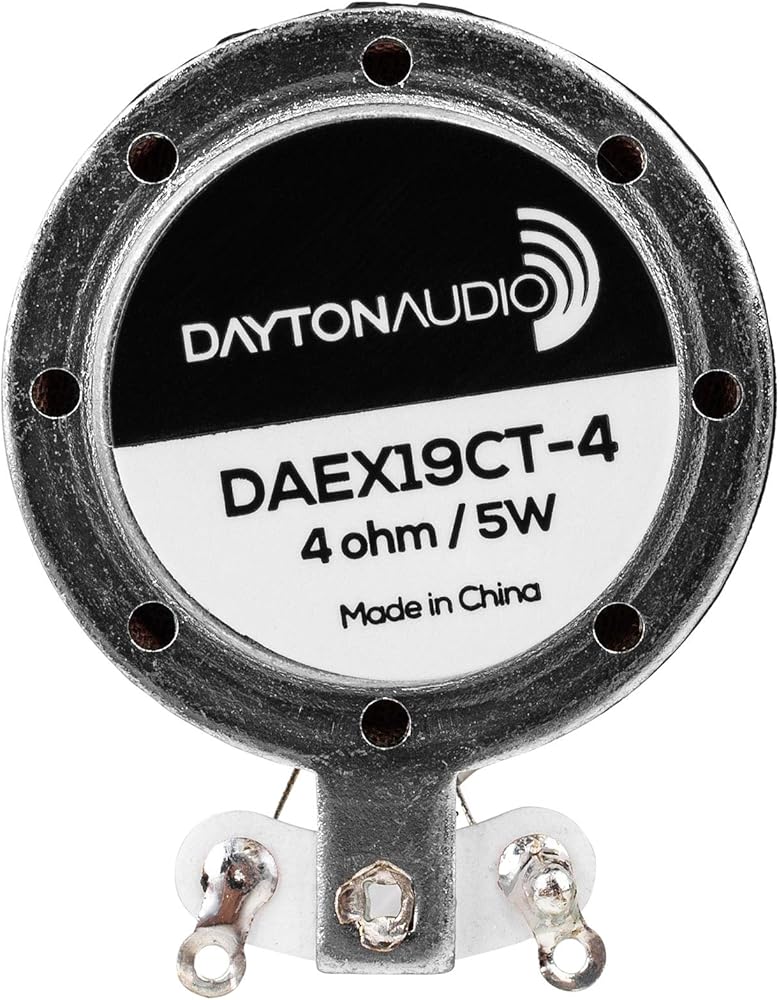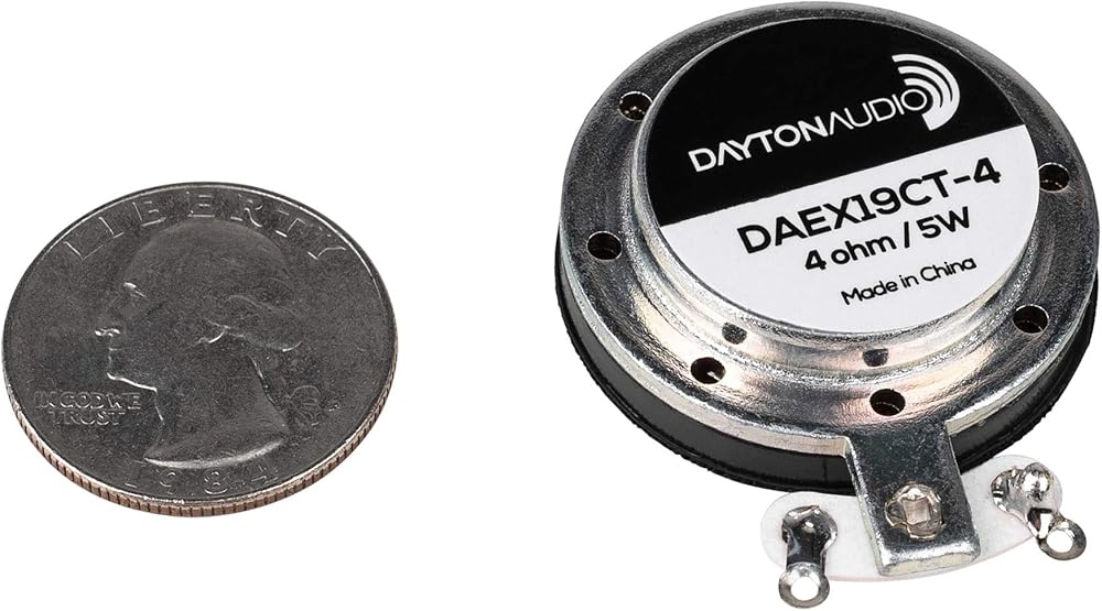 Quick Overview Take your product or project to the next level by turning into a speaker! The DAEX19CT-4 sound exciter, by Dayton Audio, features voice coil vent holes for higher power handling. Product Highlights Small size; just under 1-1/2" diameter, about 3/8" high Pre-applied 3M™ VHB™ adhesive for quick, durable installation Rare-earth neodymium motor with cooling vents for higher power handling 4 ohms impedance for use with small, Class D amplifiers Strategically-placed vent holes cool this exciters voice coil for higher power handling Product Manuals / Spec Sheets / Downloads Dayton Audio DAEX19CT-4 Specification Sheet AddThis Sharing Buttons Share to FacebookFacebook Share to TwitterTwitter Share to MoreAddThis Product Description Dayton Audios 19 mm DAEX19CT-4 coin type exciter features the same ability to turn nearly any surface into a speaker, as other exciters and tactile transducers, only in a more compact package for working with smaller surfaces. This exciters small size enables audio reproduction in places never imagined: toys, monitors, cabinet doors... even windows! A neodymium magnet is employed to create maximum magnetic flux around the proprietary voice coil for increased sensitivity when compared to similar sized exciters. In turn, this reduces power requirements and makes it possible to use very small audio amplifiers, without sacrificing total output. Cooling holes placed strategically on this exciters housing allows for higher power handling, for applications where more output is desired, while maintaining a small form factor. To ensure maximum acoustic energy transfer between the transducer and the surface to which it is attached, 3M VHB (Very High Bond) adhesive is pre-applied... just peel and stick! Two PCB solder points keep installation and wiring as compact as possible. Note: An exciters frequency response and sensitivity are completely dependent on the exciters designated surface. Thinner, smaller materials will tend to be louder and create a mid/tweeter response. Thicker, larger materials (with multiple exciters) will be slightly quieter but result in a more full-range sound. Adhesive dimensions: 21.5 mm (outside diameter) 21.75 mm (inside diameter) To understand more about exciter technology, here is a link to the Exciters Buyers Guide . Product Details Speaker Series Exciters Model Number DAEX19CT-4 List Price $7.99 Color Silver Unit of Measure Each UPC 848791000966 Warranty - Parts 5 Years Warranty - Labor 5 Years Product Shipping Weight (lbs.) 0.05 Speaker Type Exciter Power Handling (RMS) 5 watts Power Handling (max) -- Continuous Program Power -- Impedance 4 ohms Sensitivity -- Frequency Response -- Voice Coil Diameter 19 mm Magnet Weight -- DC Resistance (Re) 3.8 ohms Voice Coil Inductance (Le) 0.04 mH @ 1 kHz Resonant Frequency (Fs) 637 Hz Mechanical Q (Qms) -- Electromagnetic Q (Qes) -- Total Q (Qts) 2.34 Diaphragm Mass Inc. Airload (Mms) 0.58 g Moving Mass Of Diaphragm (Mmd) -- Mechanical Compliance of Suspension (Cms) 0.0001 mm/N Surface Area Of Cone (Sd) -- Volume of Displacement (Vd) -- BL Product (BL) 1.78 Tm Compliance Equivalent Volume (Vas) -- Maximum Linear Excursion (Xmax) -- Drivers Mechanical Losses (Rms) -- Entry / Exit Diameter -- Surround Material -- Voice Coil Wire Material -- Voice Coil Former -- Basket/Frame Material -- Magnet Material -- Overall Outside Diameter 33 mm dia. Overall Depth 13 mm Baffle Cutout Diameter -- Mounting Hole Diameter -- Bolt Circle Diameter -- Product Weight --