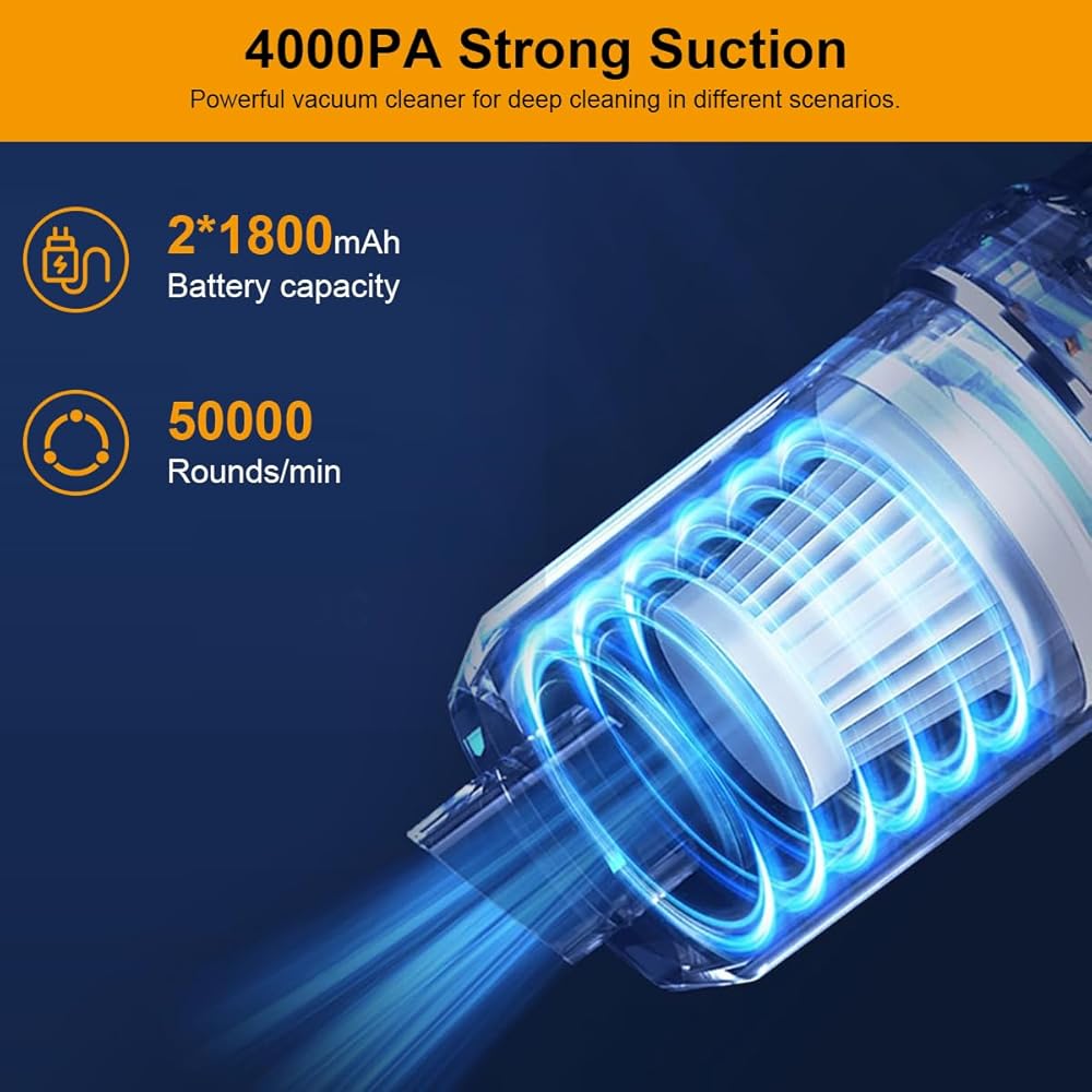 2-In-1 Mini Vacuum Cleaner: The vacuum cleaner with advanced 2-in-1 technology of blowing and suction is very helpful for you. The handheld vacuum cordless has a high power of 4000pa and 50W super motor. You can use it to easily clearing away dirt and debris from hard-to-reach corners and crevices. Making it perfect for use in your home.,office or car. Enjoy optimal results with this versatile and effective cleaning tool.