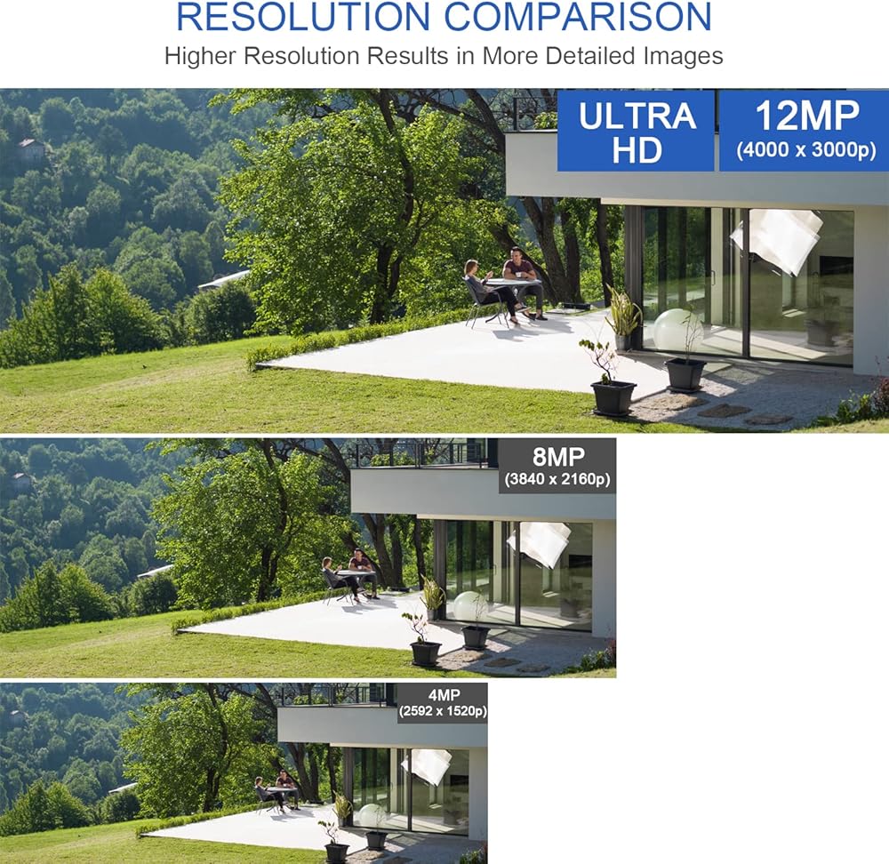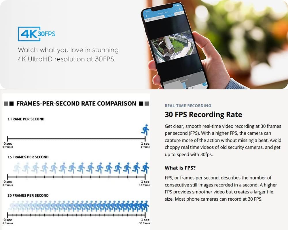12MP @15FPS, 4K @30 FPS Recording Rate - Get clear, smooth real-time video recording at 30 frames per second (FPS). With a higher FPS, the camera can capture more of the action without missing a beat. Avoid choppy real time videos of old security cameras, and get up to speed with 30fps.