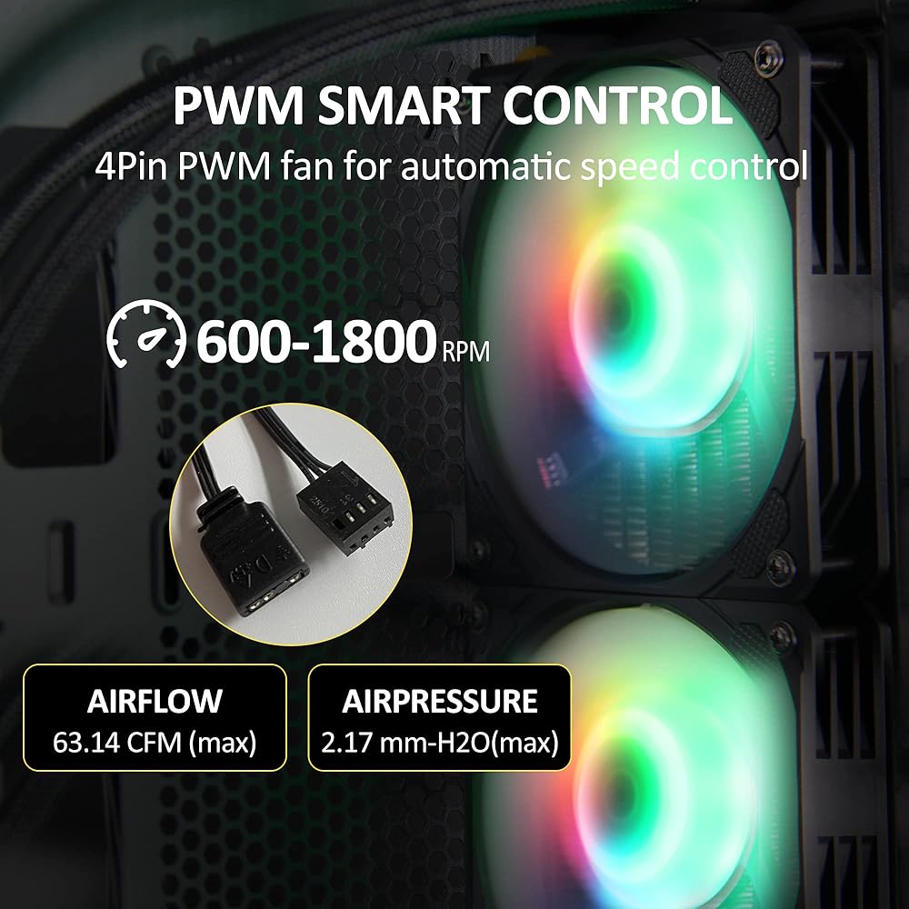 【ADDRESSABLE RGB PWM SYNC】5V 3pin argb case fan & pump for lighting effects sync,thanks to the PWM feature,keep your CPU temperatures low and your system stable, even during demanding tasks or gaming sessions.