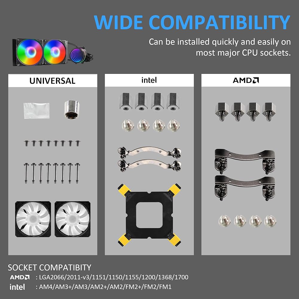【High Compatibility & Easy Installation】Our liquid cooler is compatible with Inter & AMD CPU sockets and supportsIntel LGA2066/2011-v3/1151/1150/1155/1200/1368/1700/,AMDAM4/AM3+/AM3/AM2+AM2/FM2+/FM2/FM1 and more.