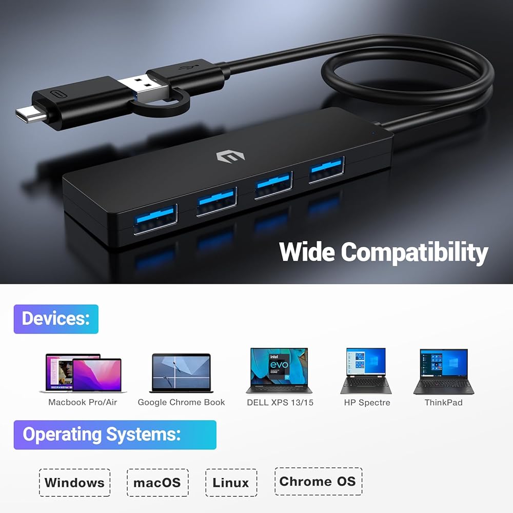 【Versatile Device Connectivity】 This hub offers versatile device connectivity, ensuring compatibility with most devices equipped with USB-A or USB-C ports. Whether you're using MacBook Air/Pro, iMac, Chromebook, HP, Xiaomi, or similar devices, it's ready to connect. Additionally, it supports operating systems such as Windows 10, 8, 7, Vista, XP, Mac OS X 10.6-10.12, and Linux 2.6.14 or later.