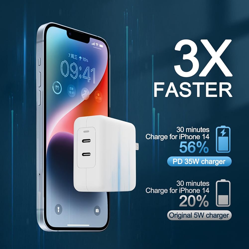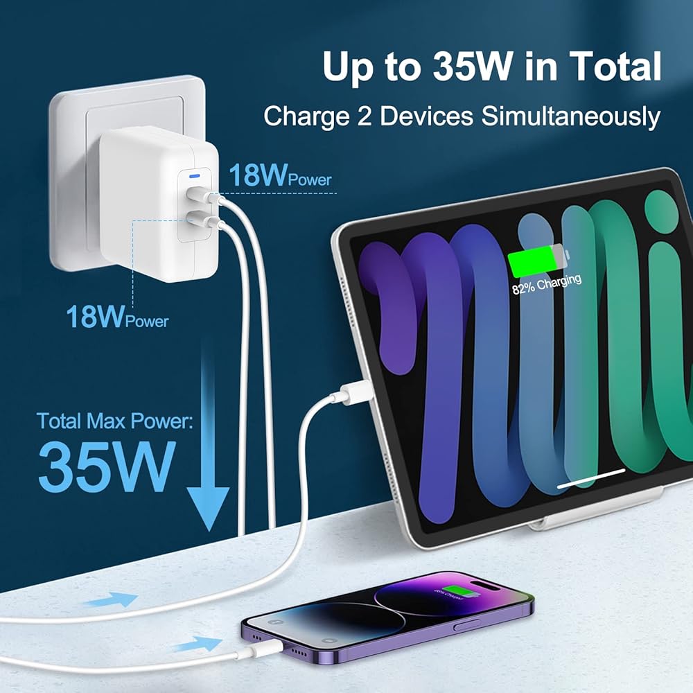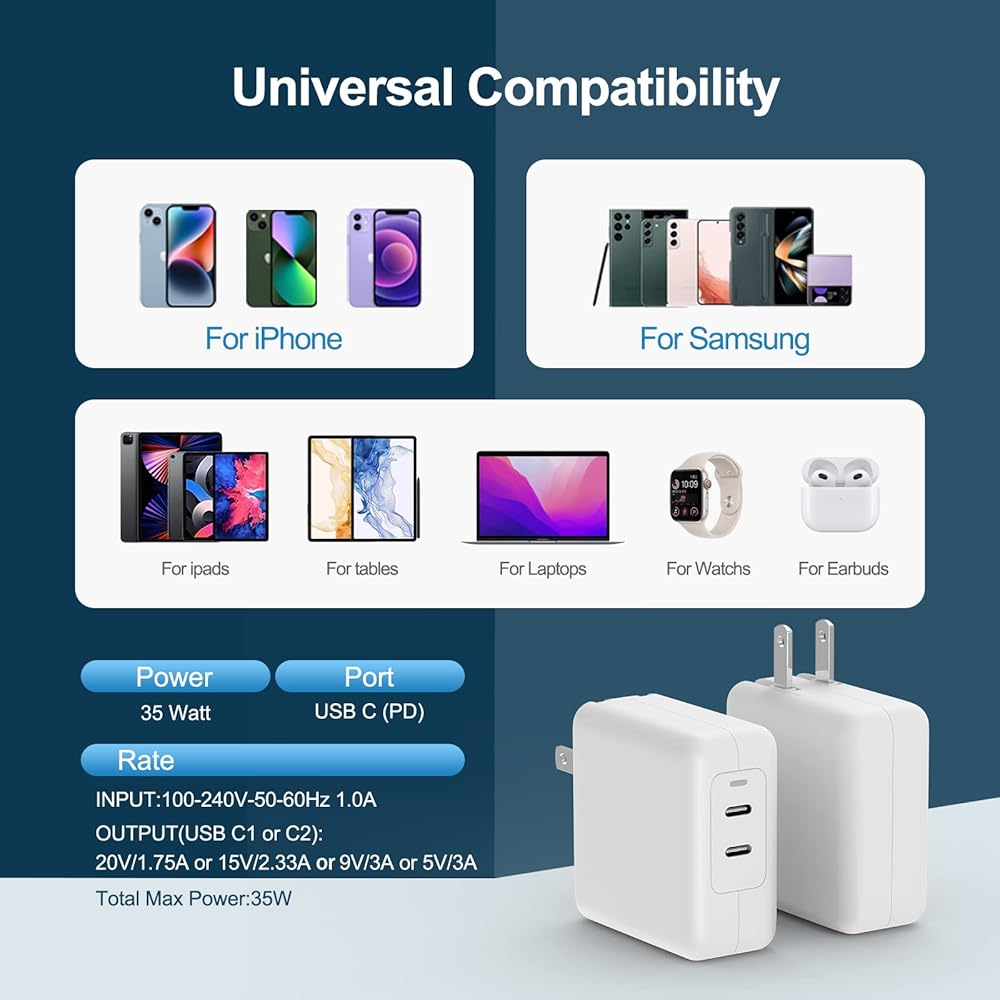 【2-Pack USB C Wall Charger】 35W iPhone Fast Charger is equipped with 2 USB-C ports to allow you to charge 2 devices at the same time. With 2-pack selection, you can take one at home/bedroom, the other one at office/living room. Enjoy quick charging for many tech essentials, Like iPhones, Samsung, iPad, Macbook