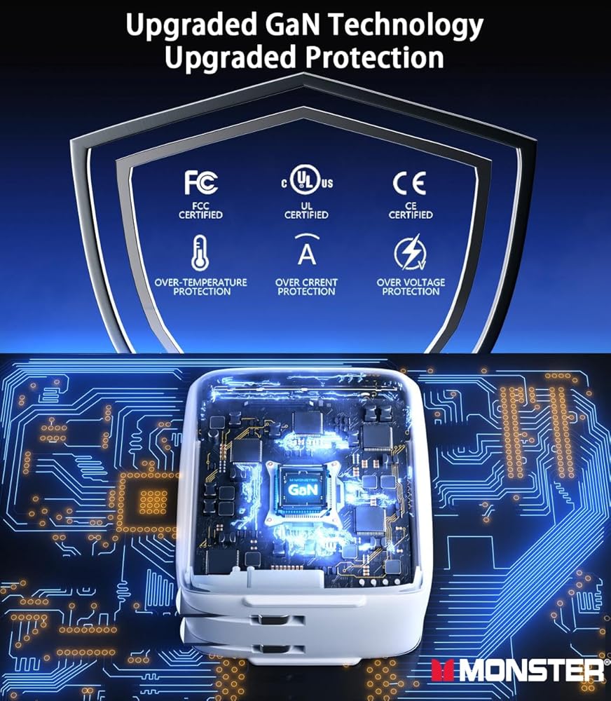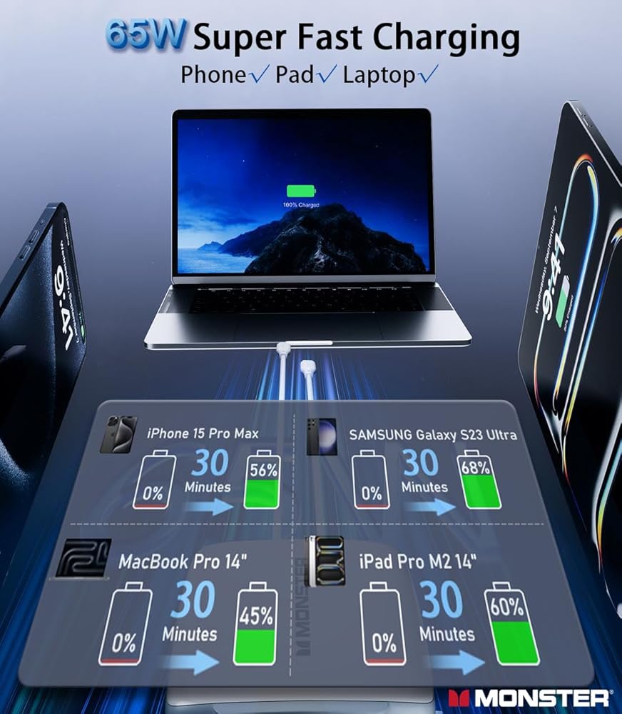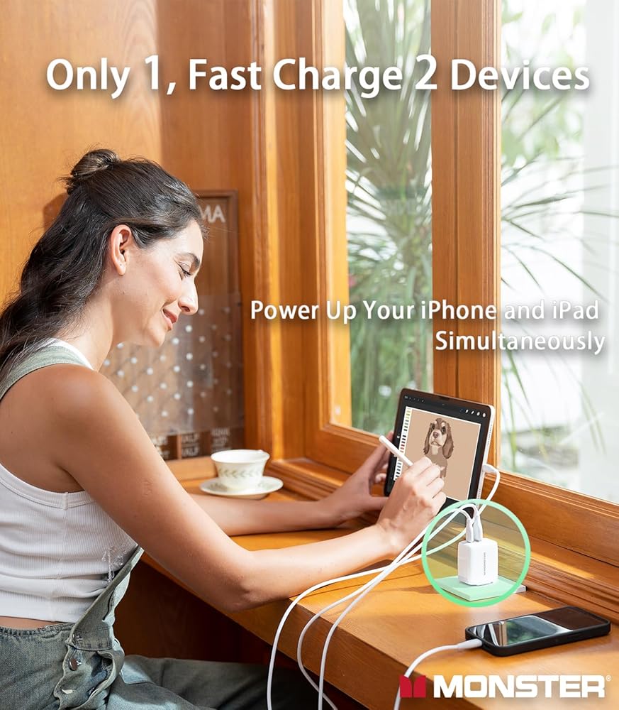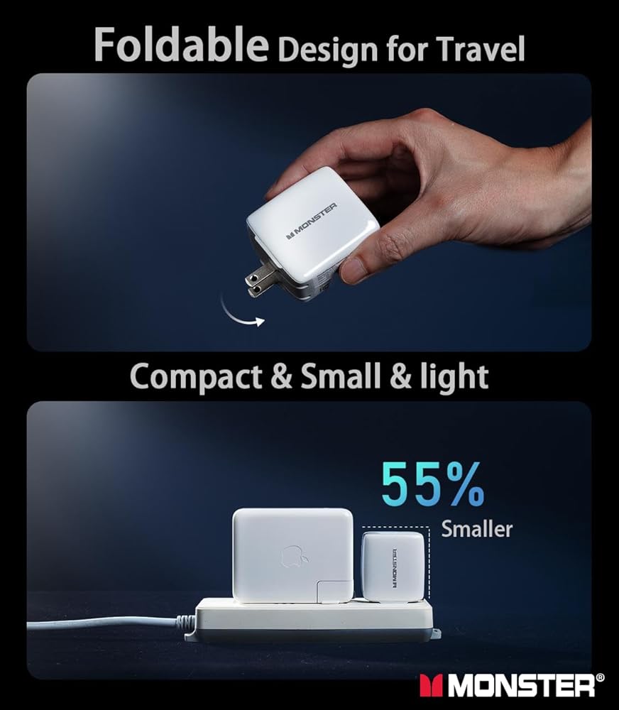 Monster 65W USB C Charger Block, PPS 2-Port, Foldable GaN Fast Charger, Heat-Free Ensure Security for iPhone 16 Pro Max/15/14, iPad, MacBook, Samsung Galaxy S25, Pixel and More, with Silicone Cable