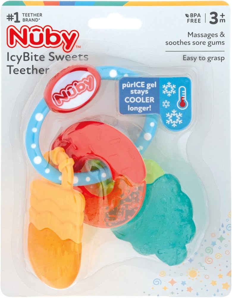 Nuby's IcyBite Sweet Treat Teether Ring is refrigerator safe and has pûrIce gel which provides your teething baby with a gentle cool teething surface that says colder longer than water. The textured surfaces massage and stimulate your babys gums and give them soothing relief from emerging teeth.