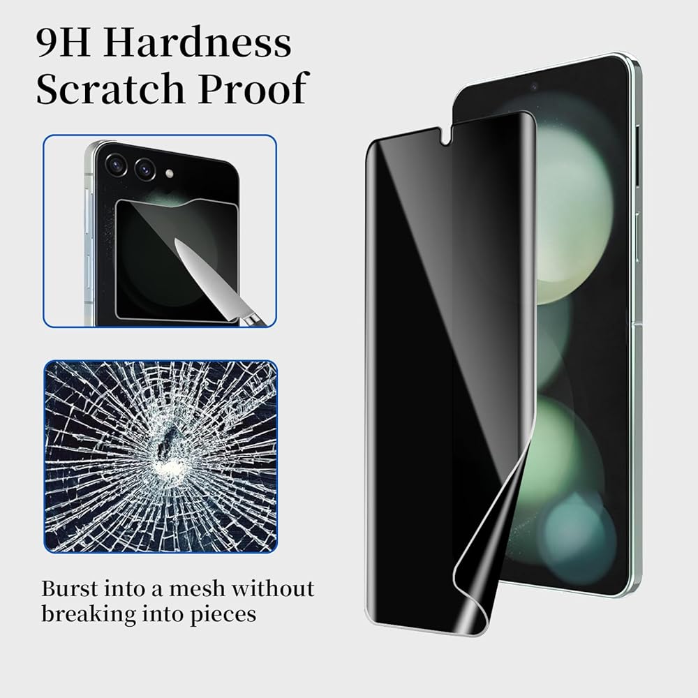 【Outer Screen 9H Tempered Glass】Our Z Flip 6 outer privacy screen protectors are constructed with 9H tempered glass, offering robust defense against scratches and damage from high-impact incidents or accidental drops.